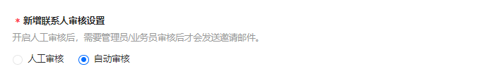 Cloud新增联系人审核设置:可选择人工审核或自动审核,开启人工审核后,需要管理员/业务员审核后才会发送邀请邮件;若开启自动审核则不需要管理员/业务员审核就可以发送邀请邮件