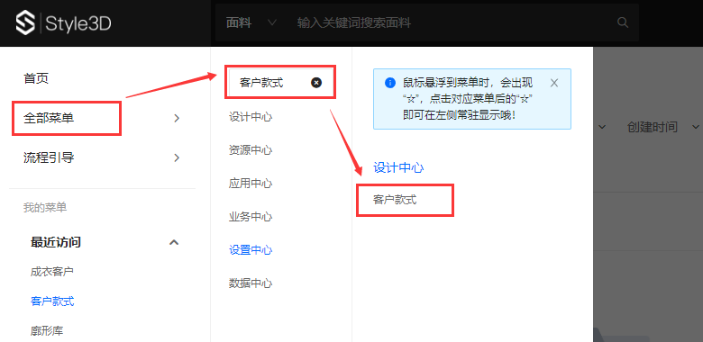 在全部菜单中,搜索客户款式,进入