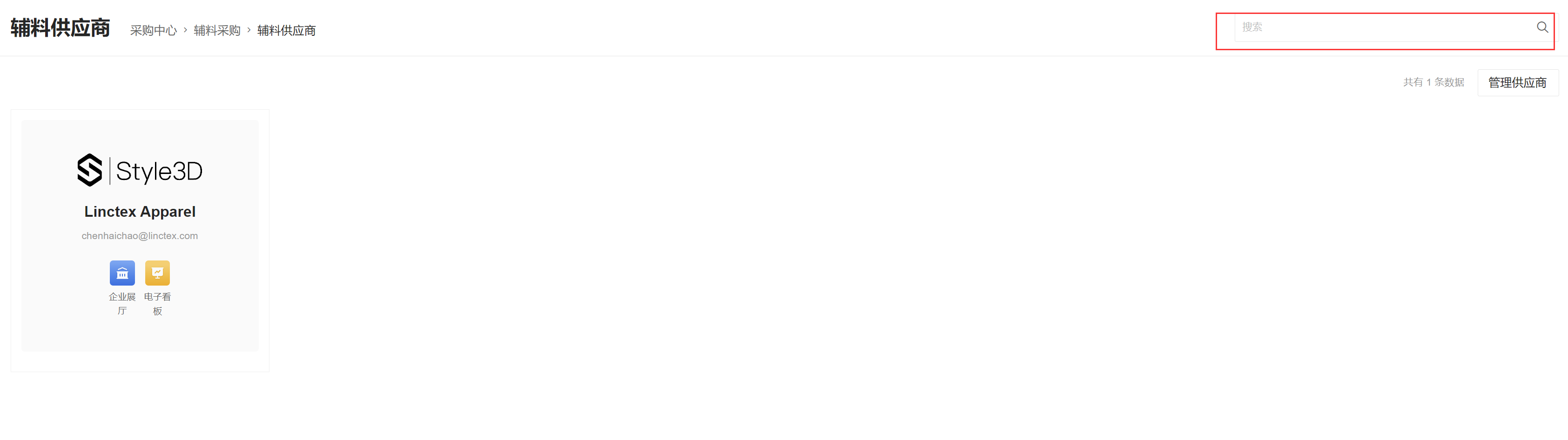 在辅料供应商页面,选择对应的供应商,如果有多位供应商,可以通过【搜索框】搜供应商的企业名称或联系人