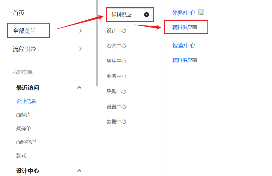 进入供应商主页,如果当前供应商推送了辅料,可以借助左侧筛选功能,进行筛选