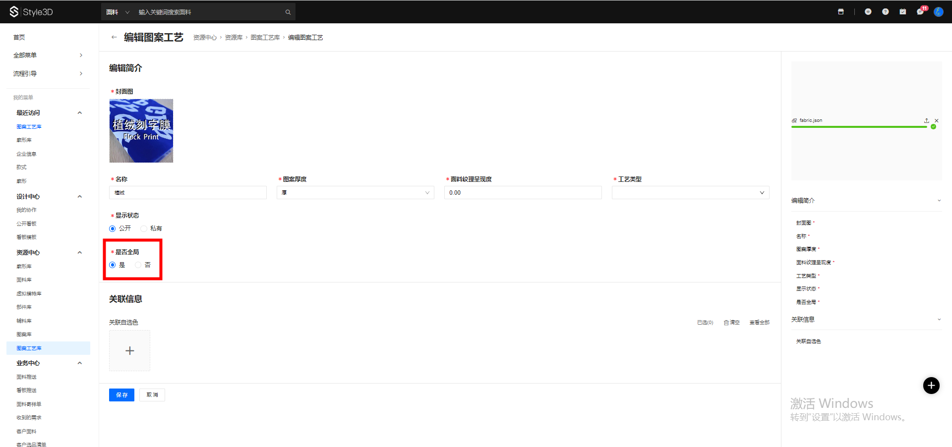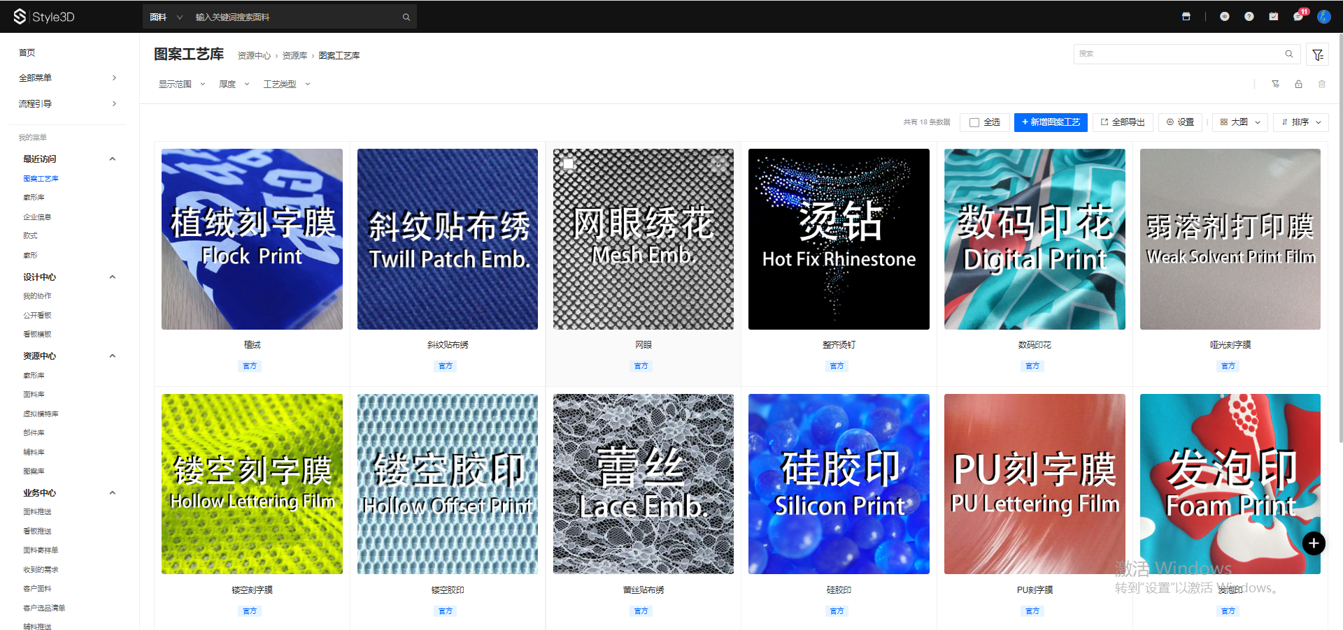 图案工艺库用于沉淀企业的3D图案工艺,图案工艺如金粉印、发泡印、网眼绣花等,可以在3D中抽象为在Style3D Fabric中对一个图案可进行渲染类型及各种贴图的效果叠加生成组合的外观效果,所以企业可将常用的图案工艺数字化、模板化后沉淀于云平台的图案工艺库中