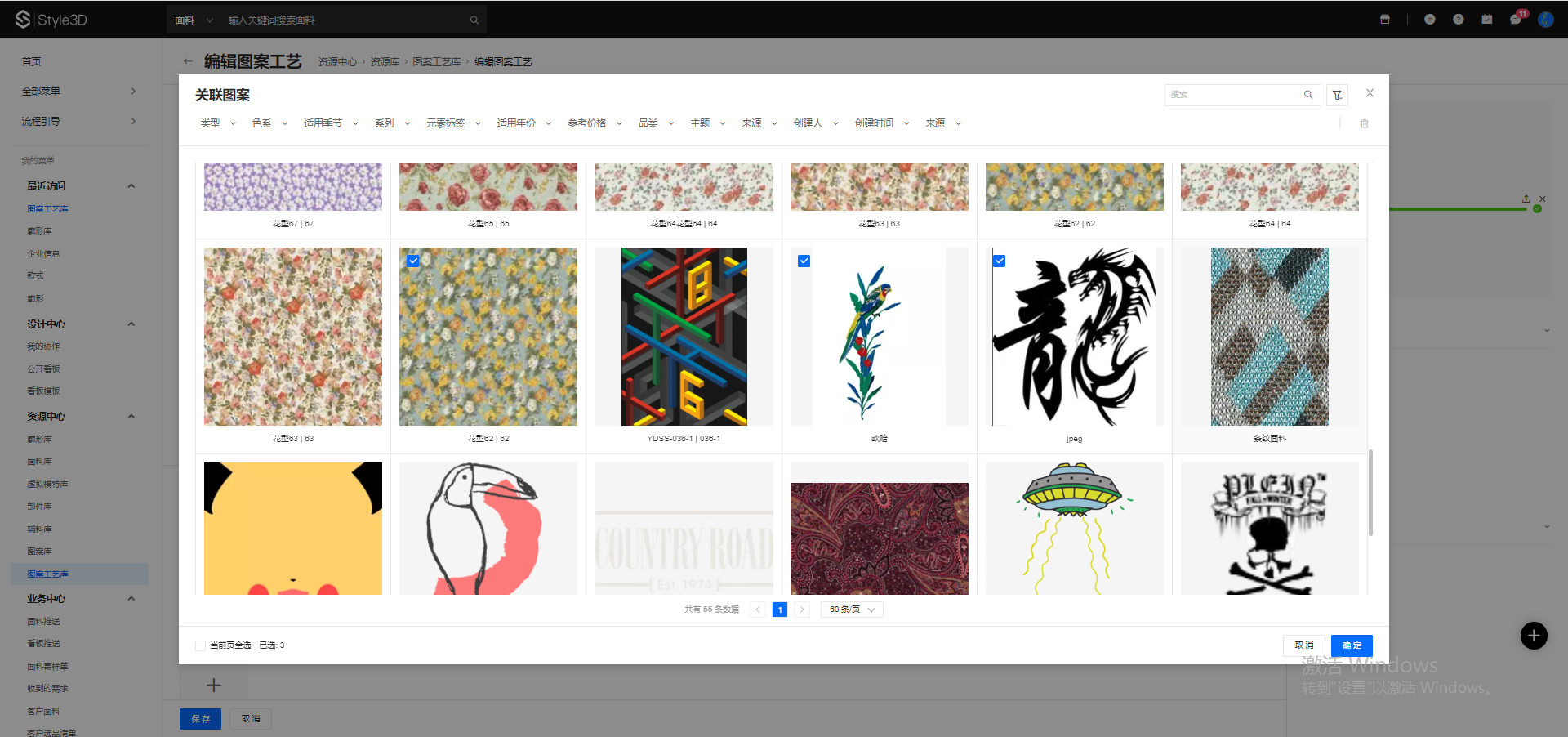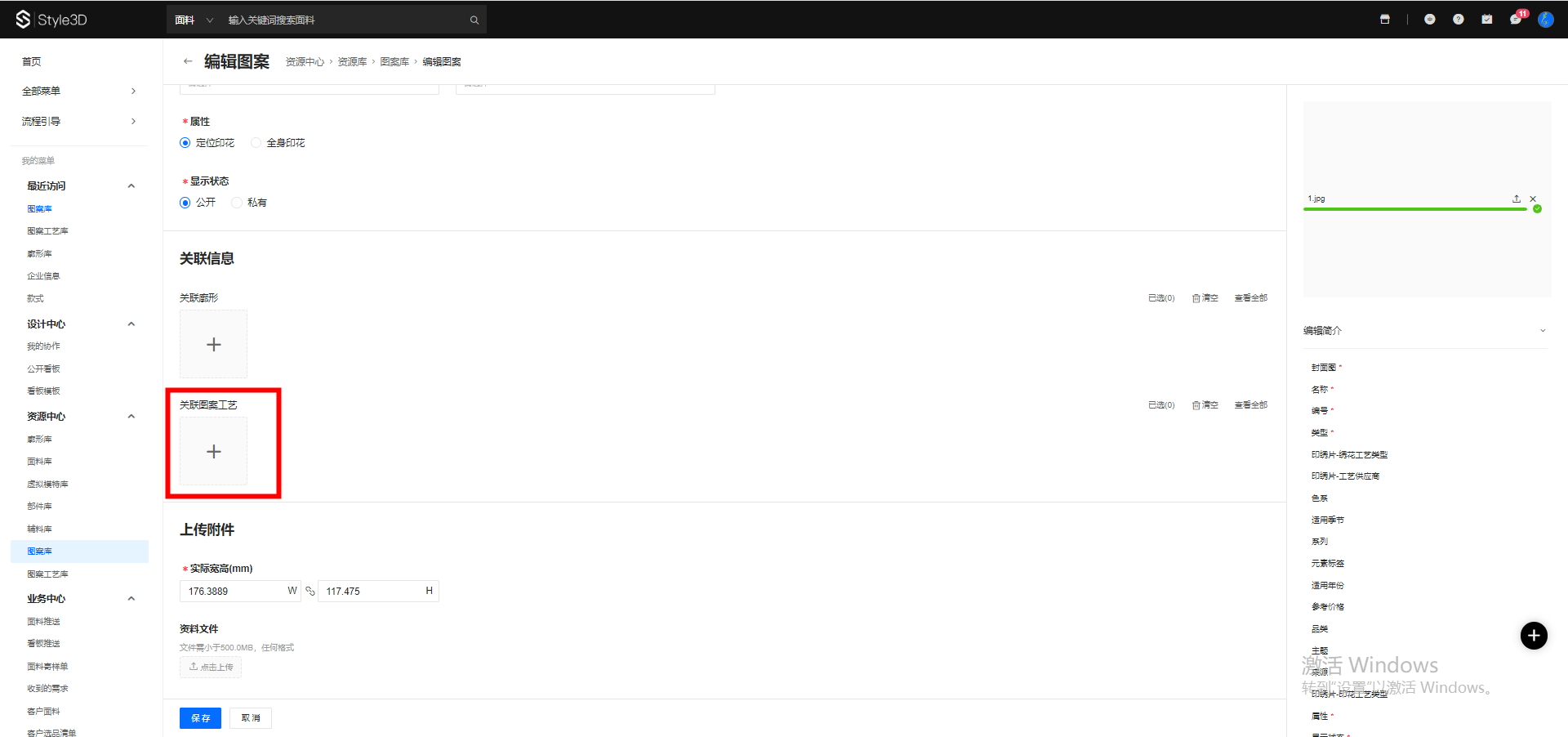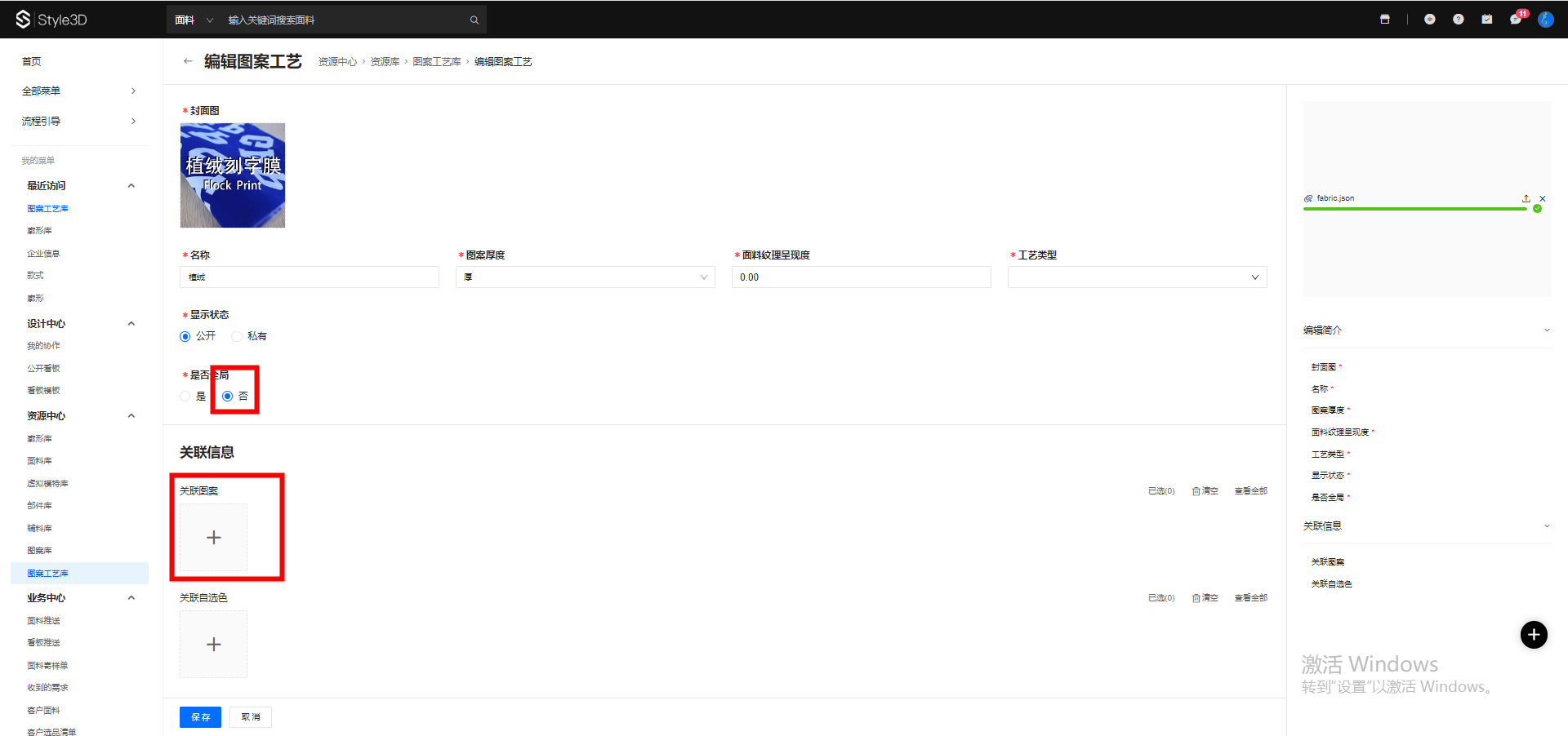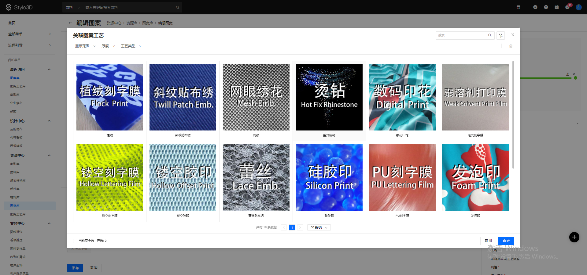 在图案编辑页中给某一个图案关联某几个图案工艺