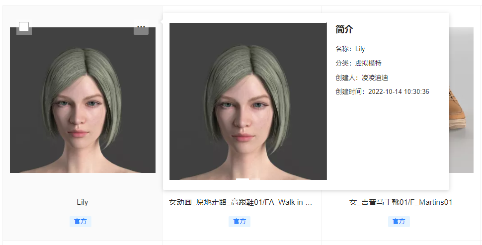 Cloud虚拟模特库作为企业基础数字资源库的组成之一,通常用于企业沉淀自有虚拟模特资源/官方市场下载的虚拟模特资源,同时,部分配套鞋子、配饰、发型、模特姿势、模特动画、衣架等相关资料沉淀在虚拟模特库中。