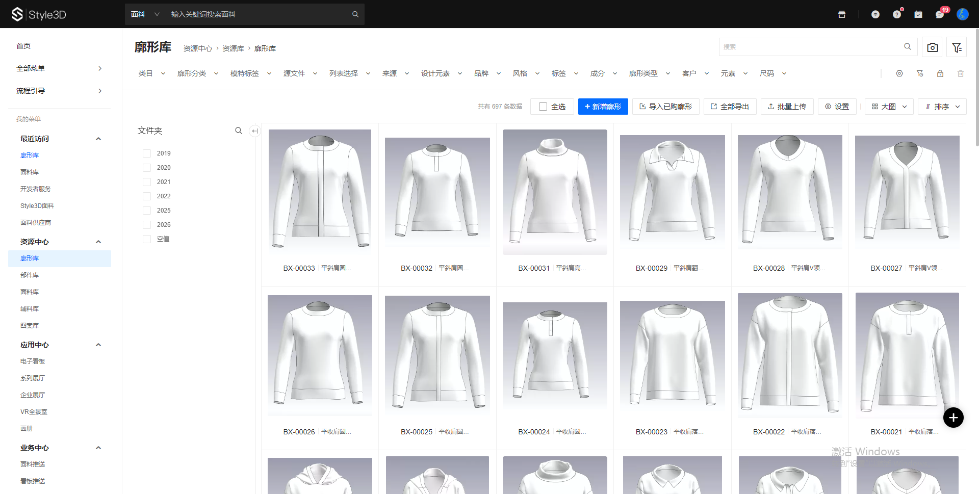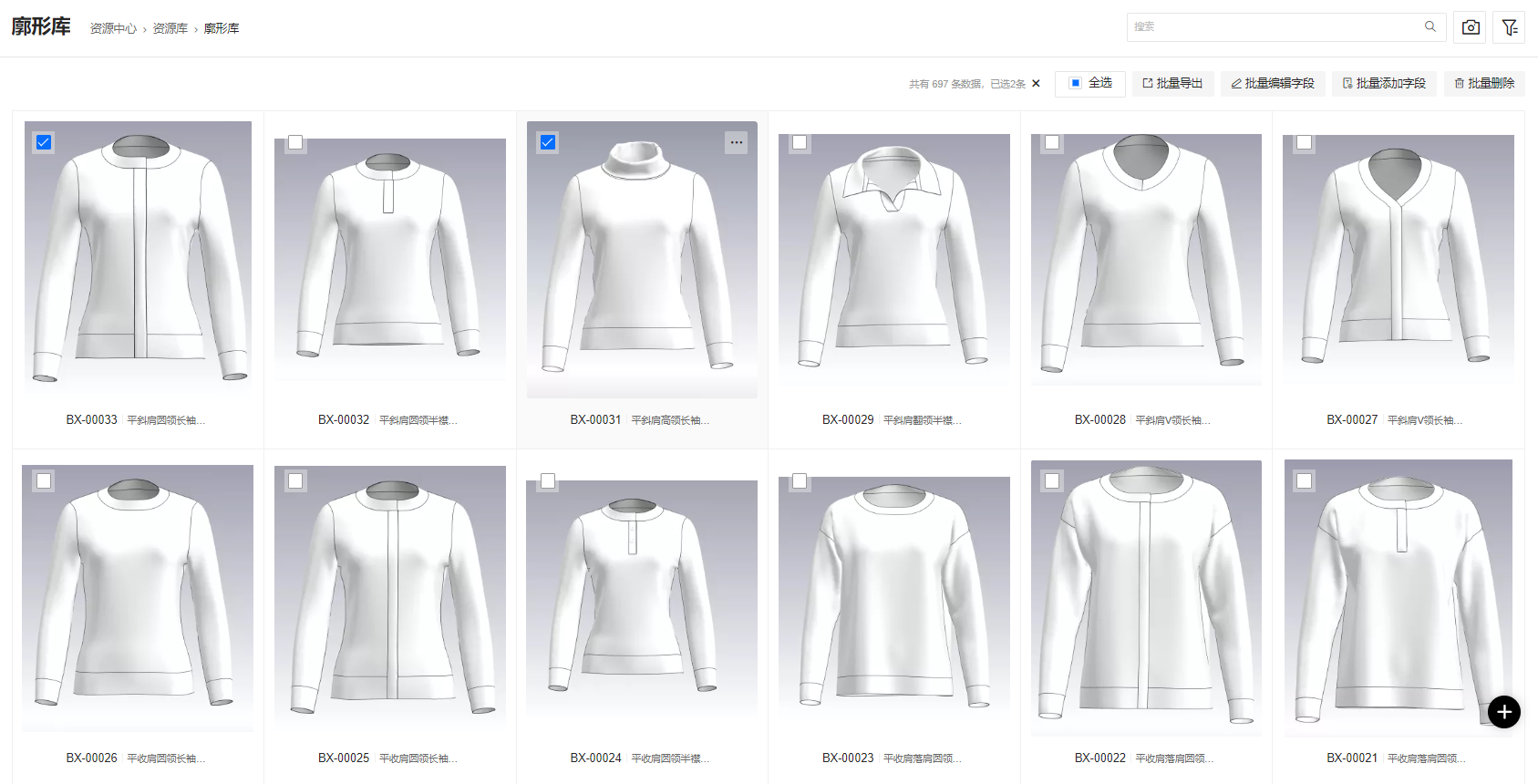 Cloud廓形库作为企业基础数字资源库的组成之一,通常用于企业沉淀服装基础廓形的版型/模型文件,将企业基础版型通过字段信息填写、3D模型上传、2D版型文件上传等操作后沉淀成为廓形库资料,后续可在款式详情页中进行面料、图案等元素的替换生成新的款式或下载至本地进行改版操作
