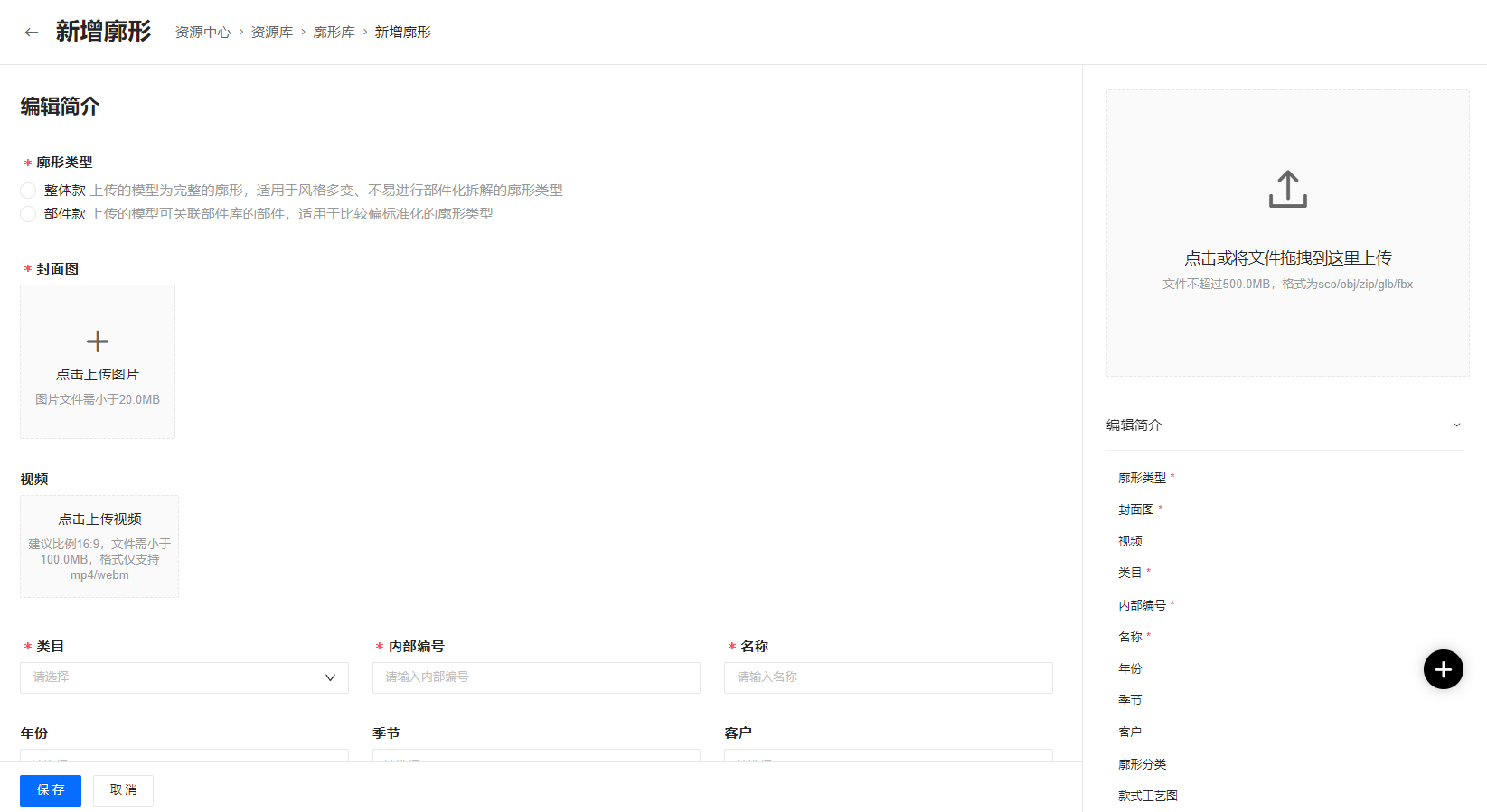 单款新增廓形:点击【+新增廓形】,填写配置好的字段信息,并上传3D模型文件、封面图、2D版型文件等,点击【保存】即可完成廓形新增。