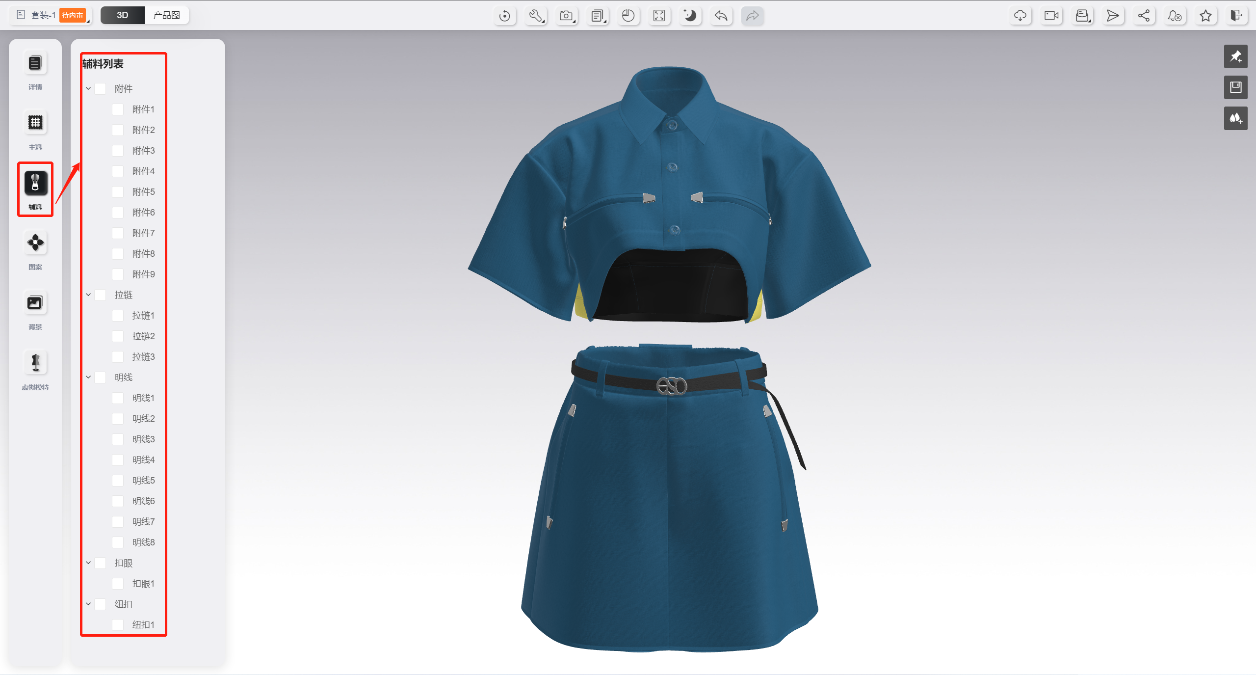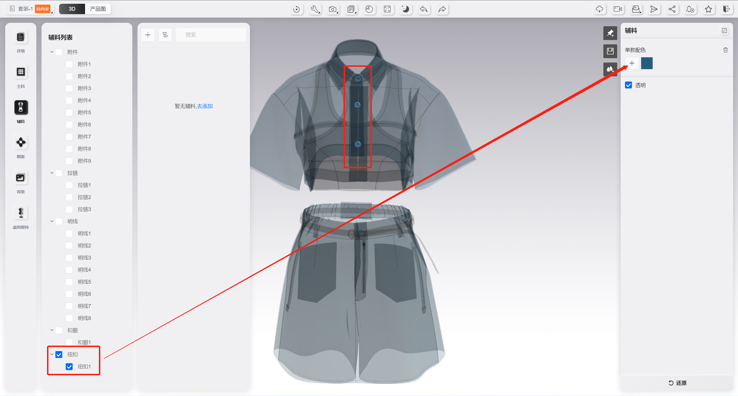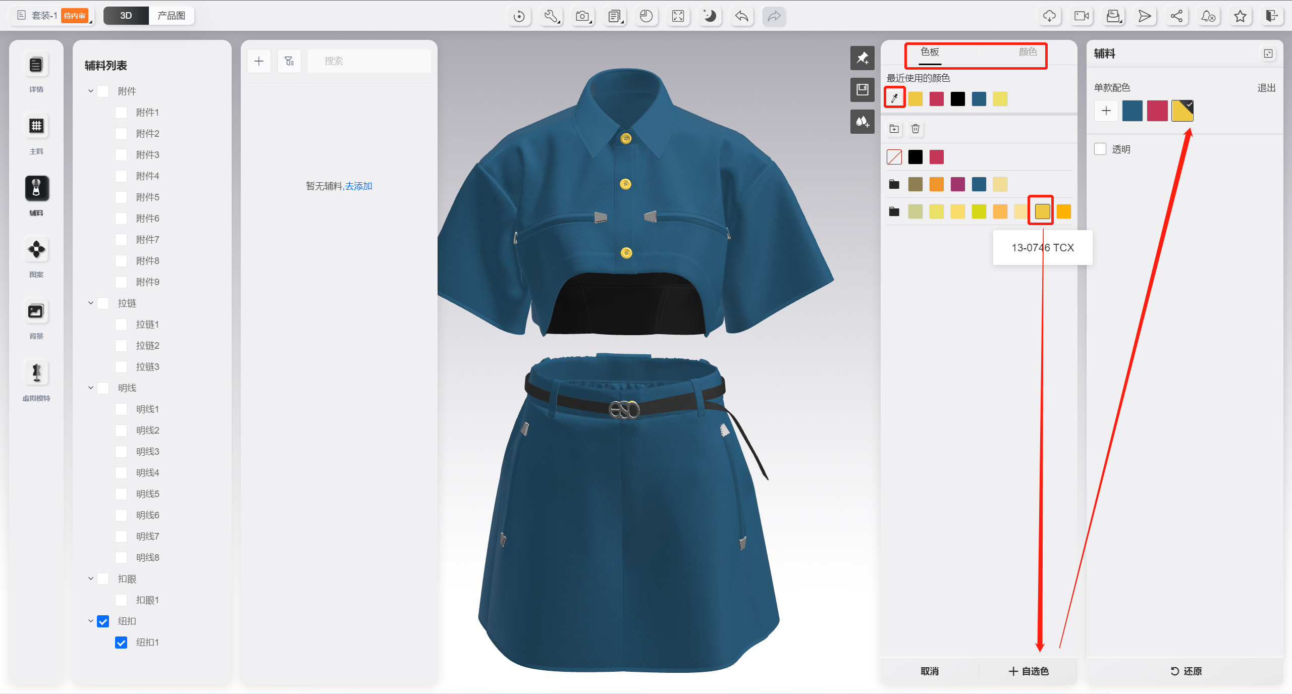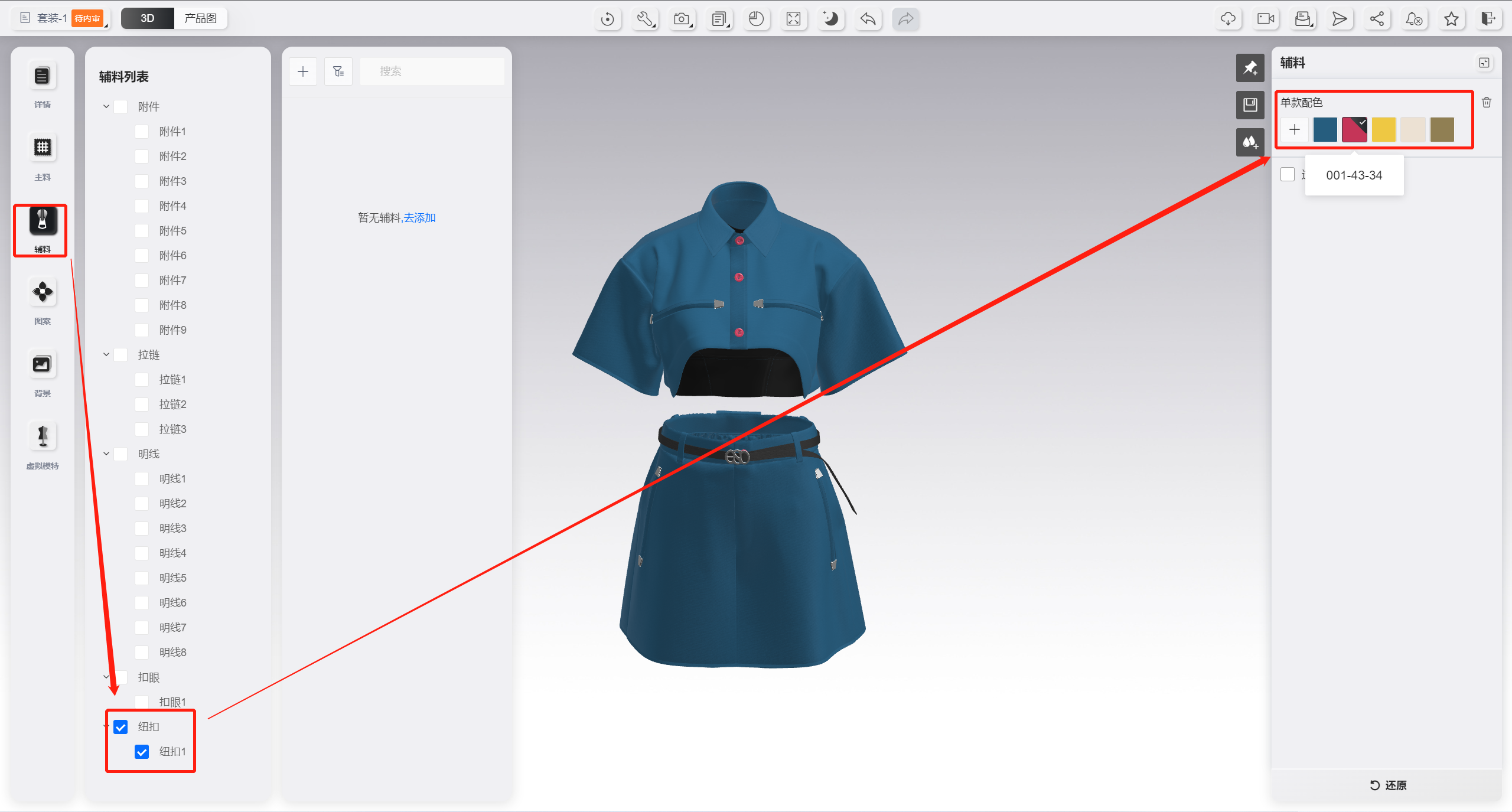 设计中心款式详情页中辅料(纽扣/拉链/扣眼/明线/附件)如何换色