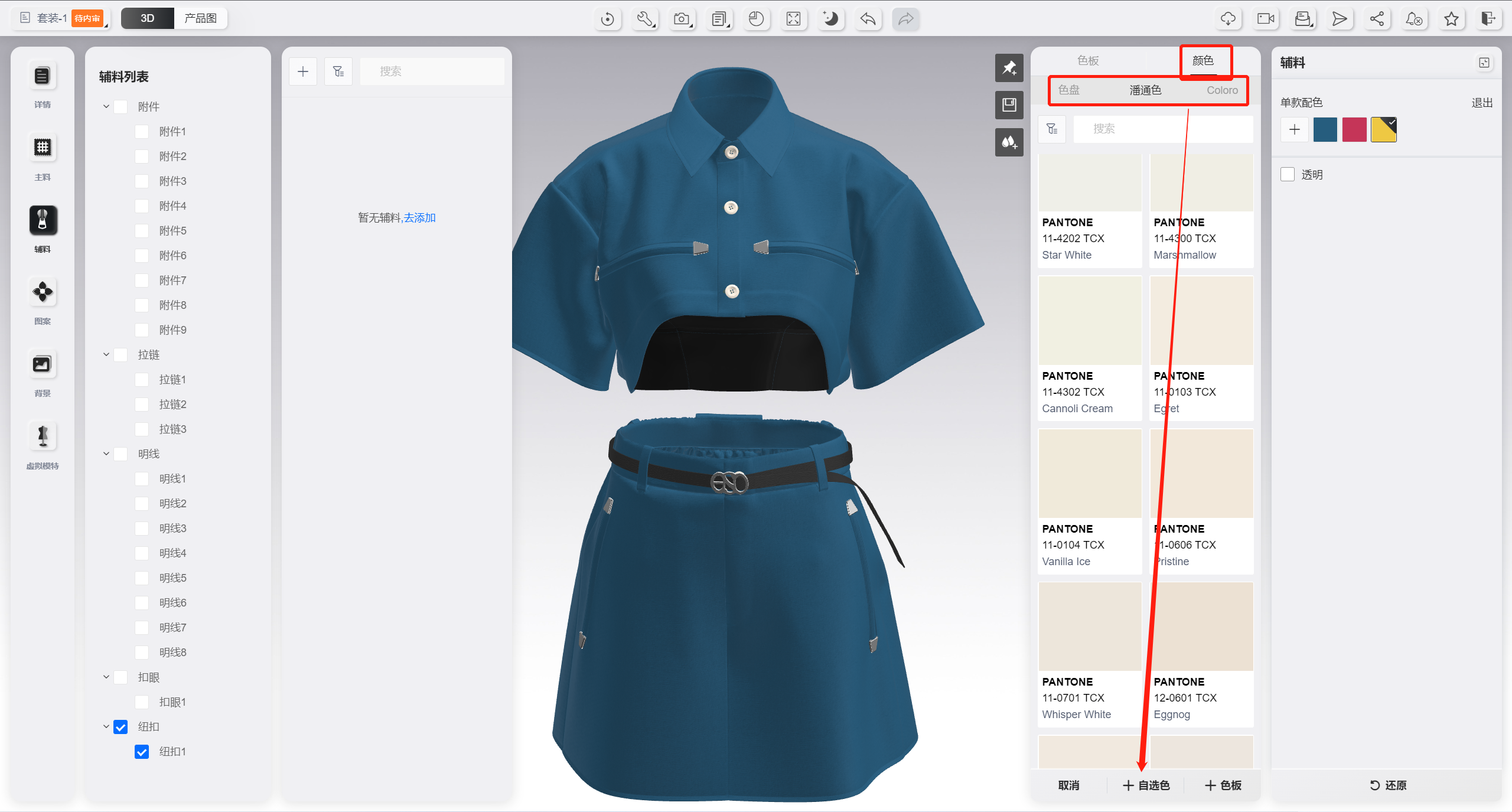 颜色添加成功后,选择辅料及对应的内容时,右侧会弹出搭配好的颜色,可单击进行自由配色