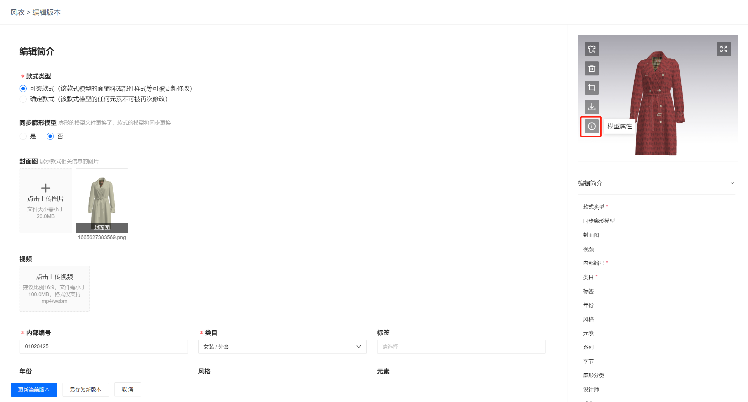 打开款式进入编辑界面,点击模型属性,编辑材质信息