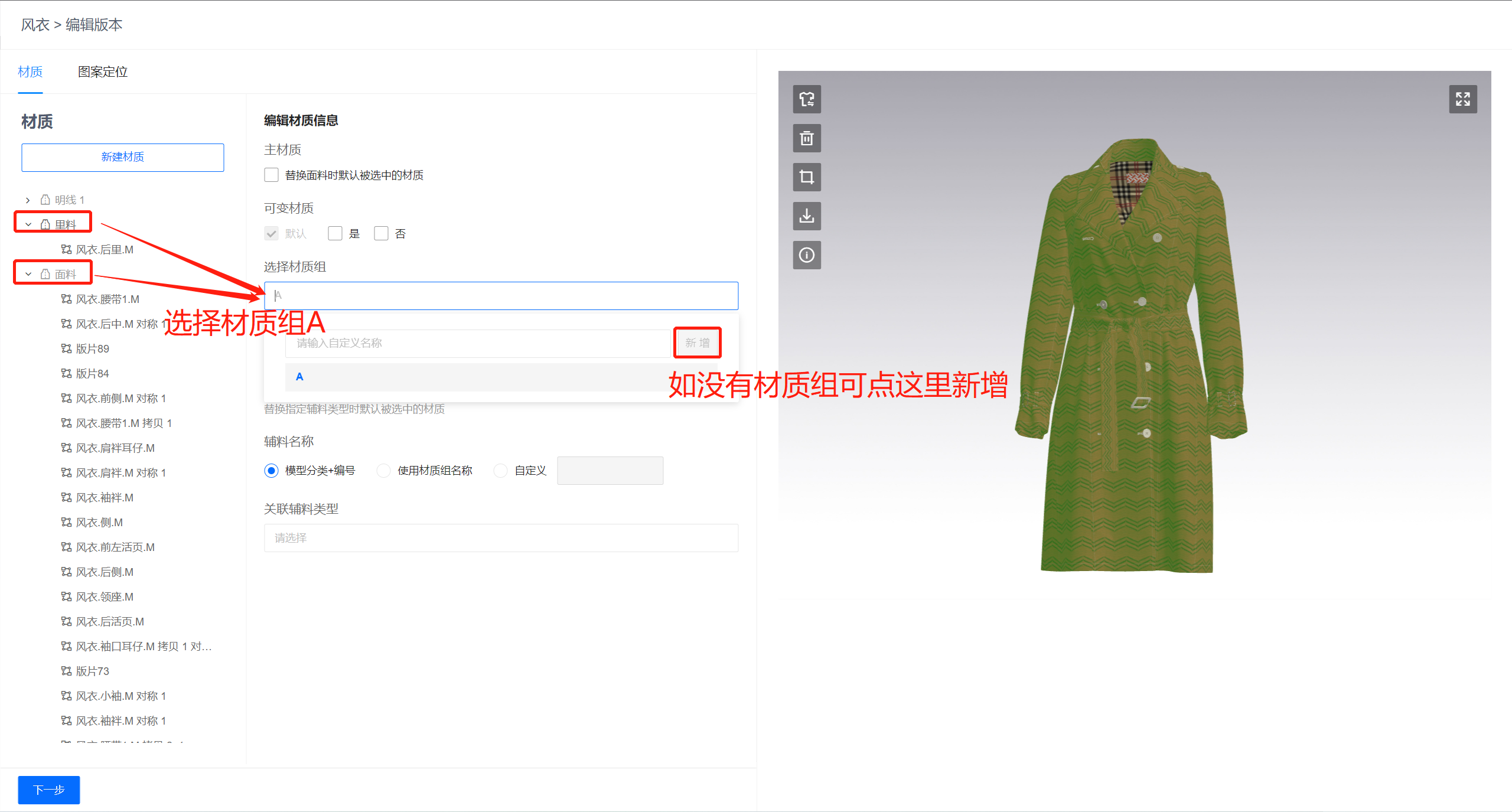 找到需要一起更换面料材质或材质分组,选择同一个材质组名称,如没有材质组名称,可“新增”自定义添加