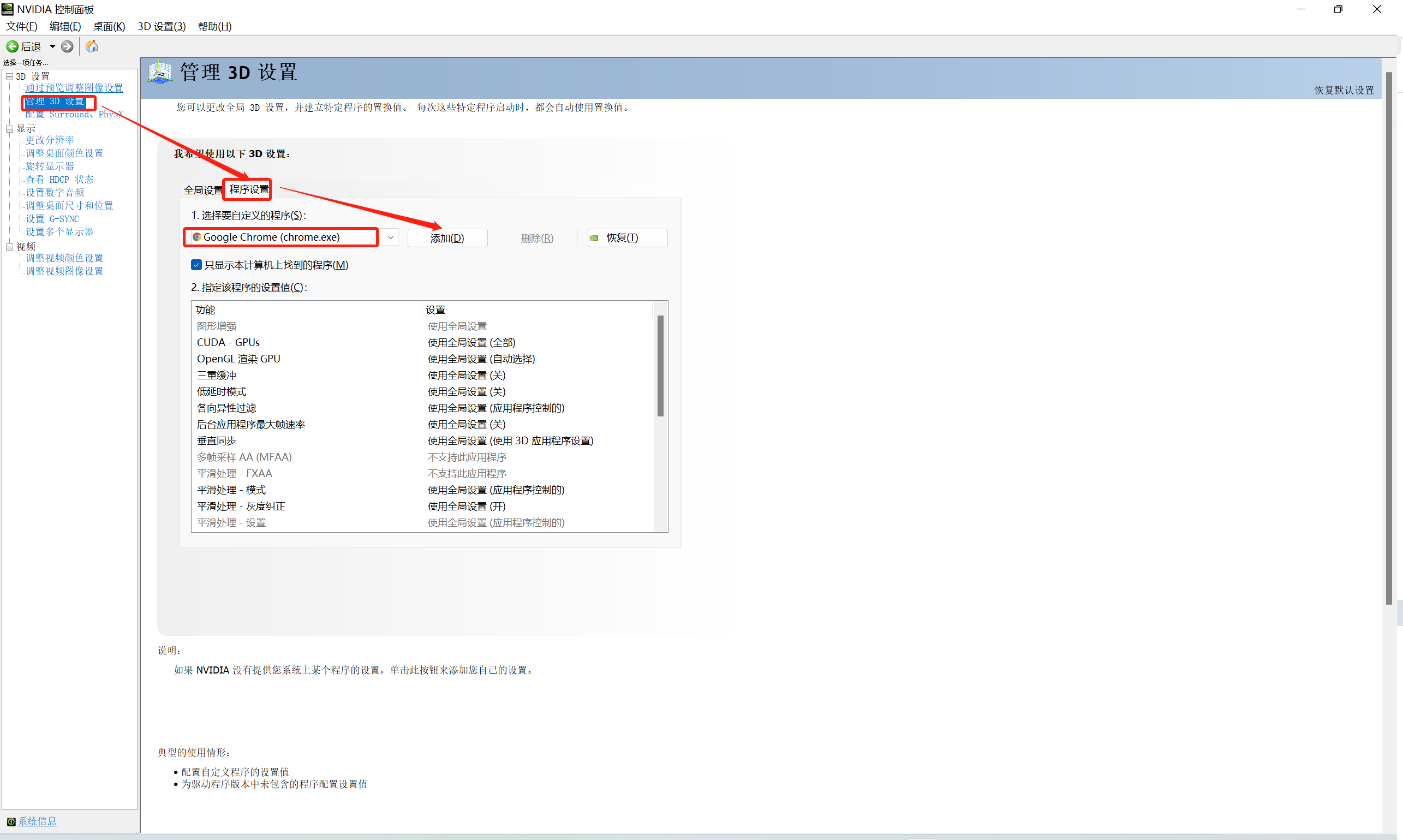 你还可以在NVIDIA显卡的控制面板中把Chrome浏览器添加进默认的应用程序,操作步骤如下: