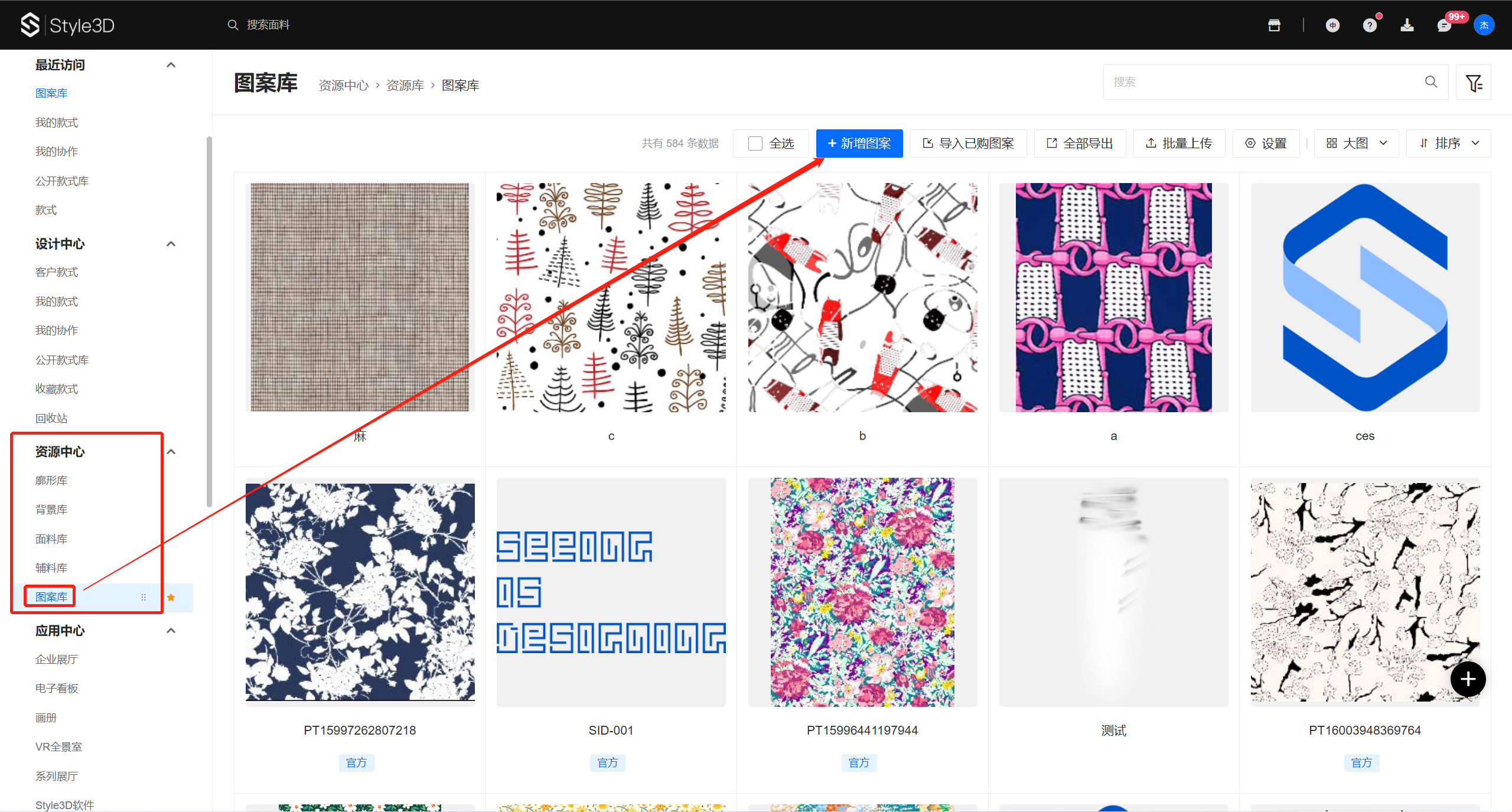 员工账号登录平台,在图案库选择【新增图案】,如账号无权限,可联系企业管理员开通对应权限
