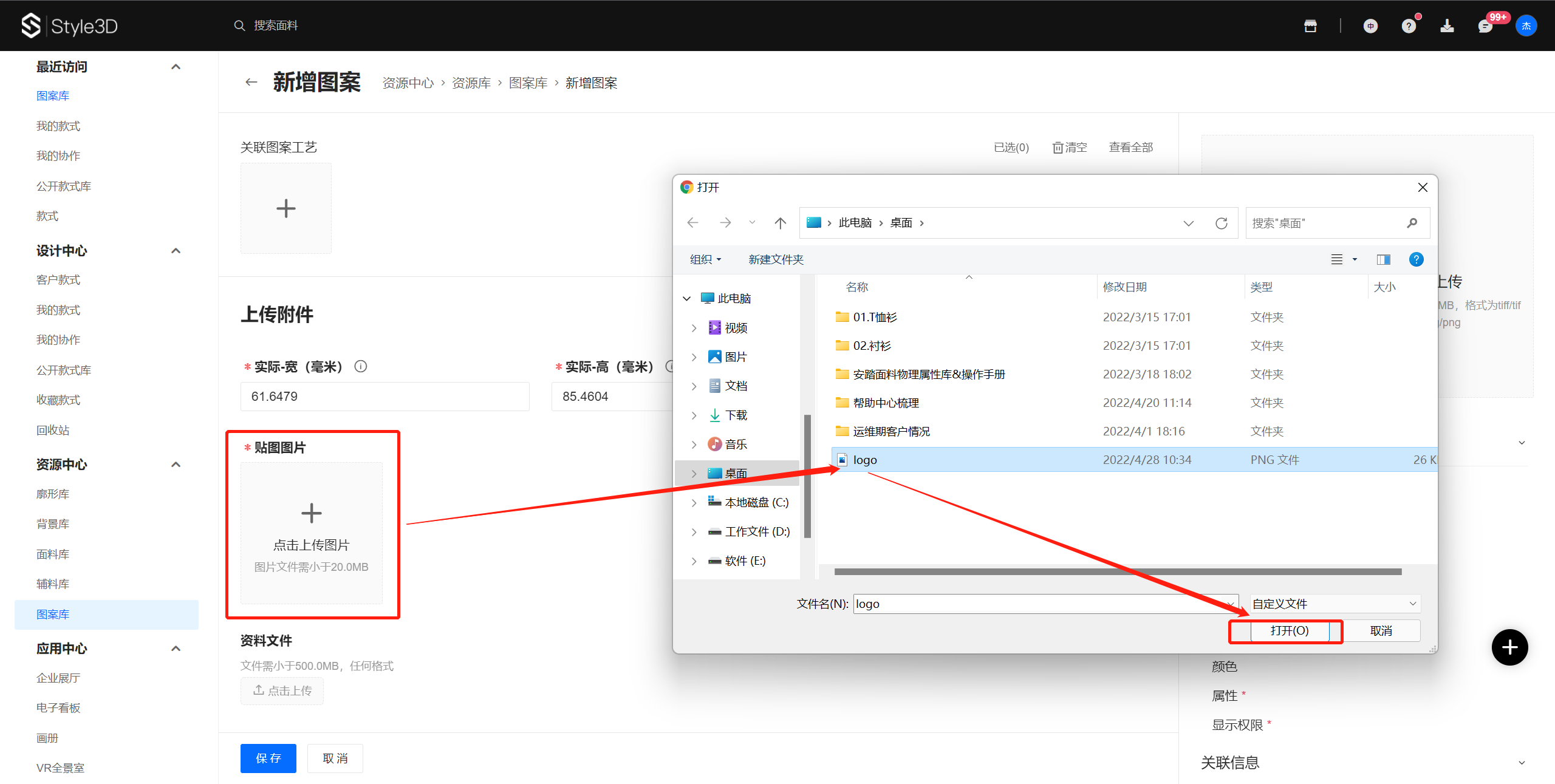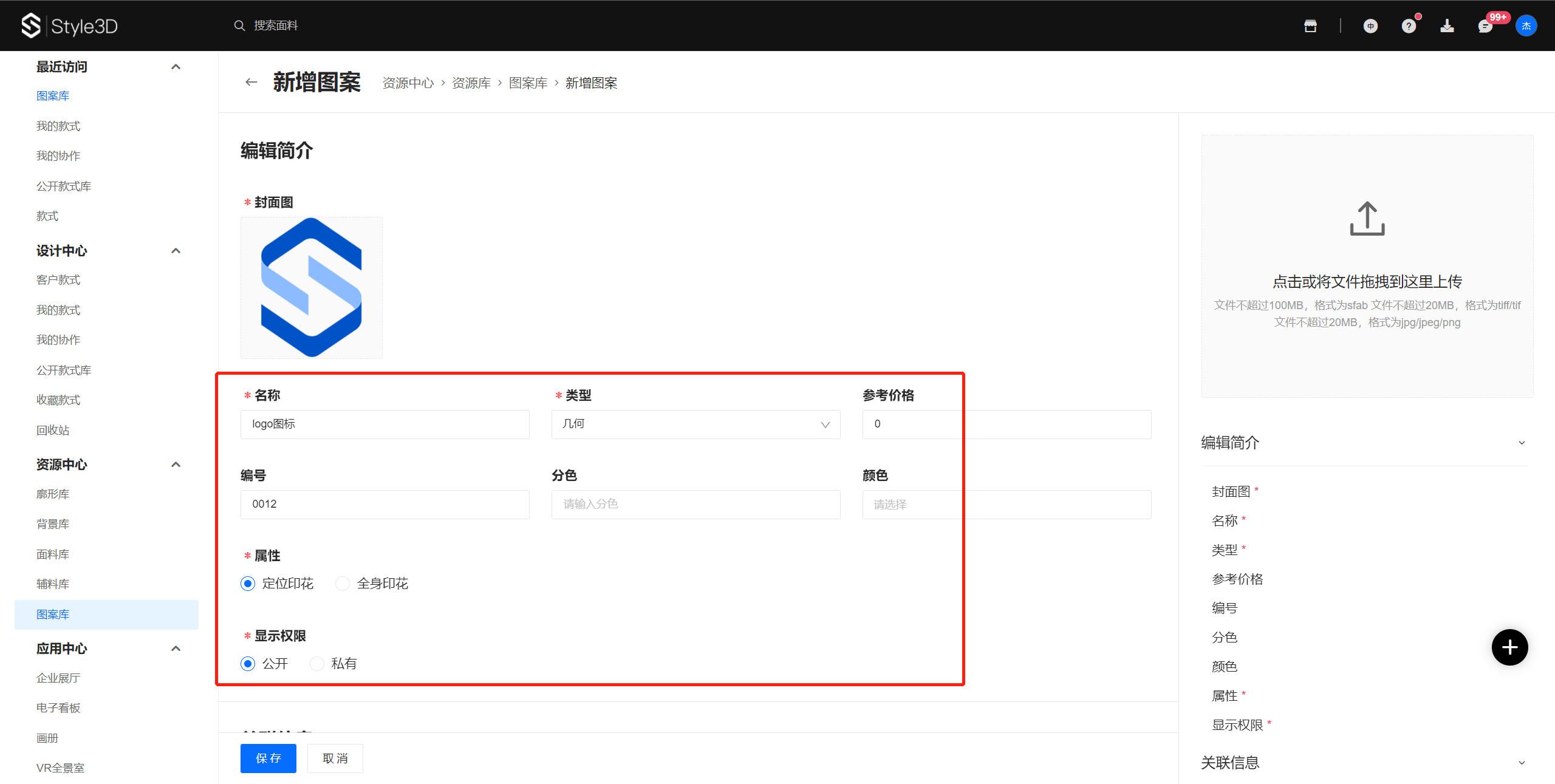 编辑页面填写相关信息,"*"内容为必填项,在【上传附件】处,选择LOGO图案,同时会自动生成封面图,点击【保存】即完成图案上传,特别注意:图片的实际宽高也会自动生成,但是由于图片尺寸是根据像素自动计算,实际宽高可能会有误差,如需要精确尺寸,请使用第三方软件获取(如ps等),获取后手动输入尺寸即可