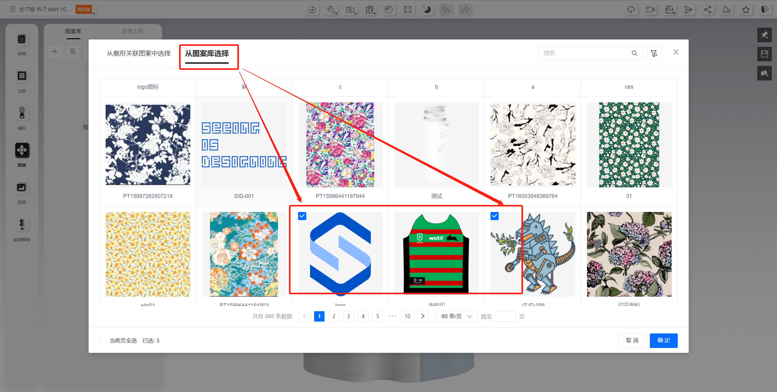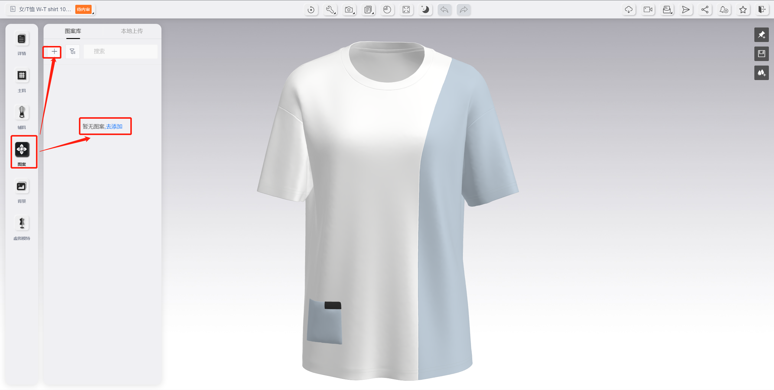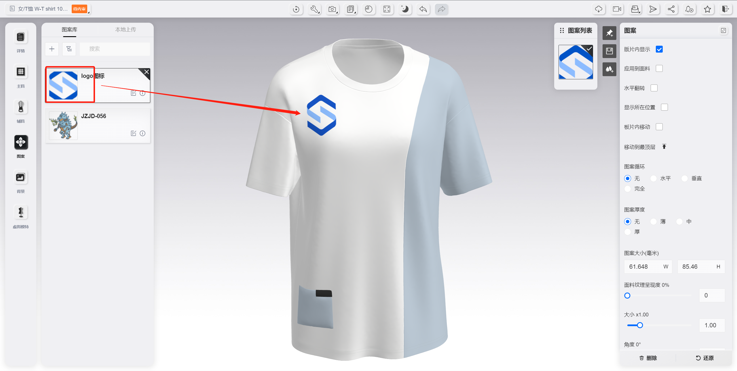 在设计中心找到对应款式,打开详情页,在左侧功能区选择【图案】,添加图案库已上传的LOGO图片,可单击选择多个图案