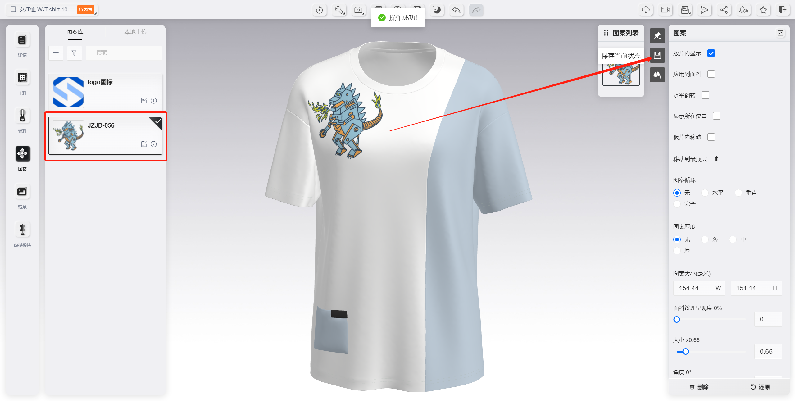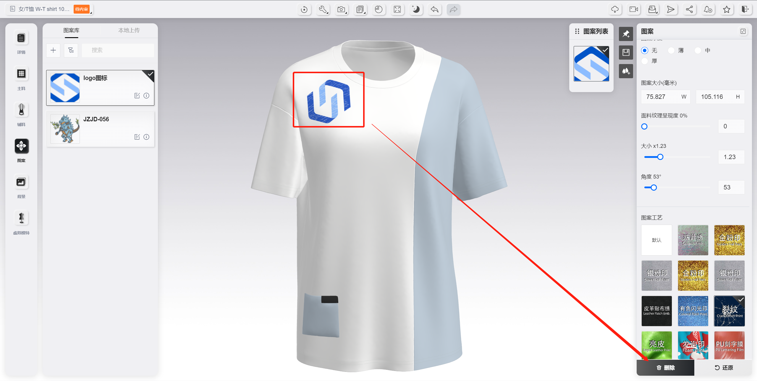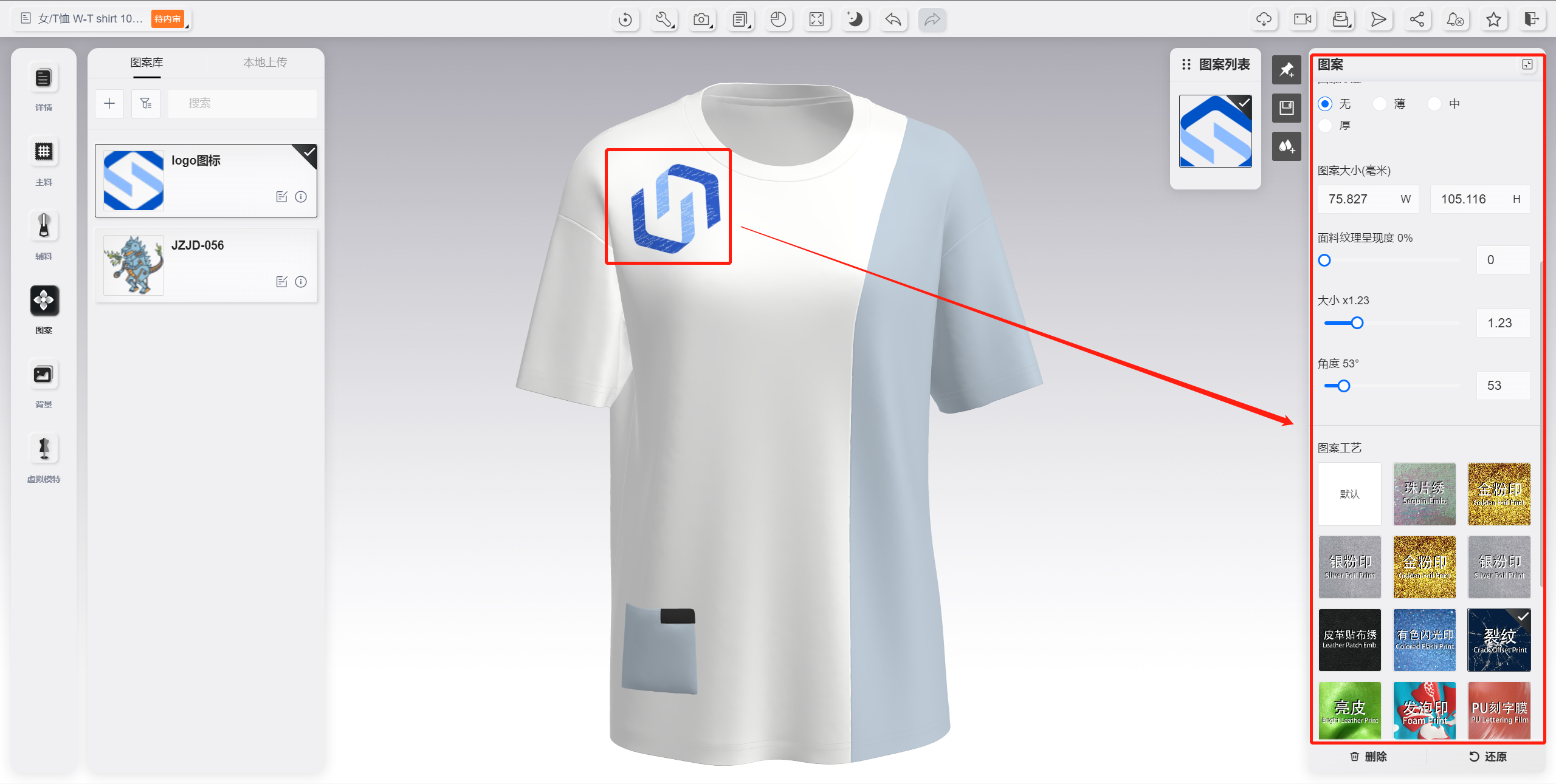 选中服装上的图案,右侧会弹出图案编辑功能区,可以对图案进行大小/角度/及特殊工艺的设计