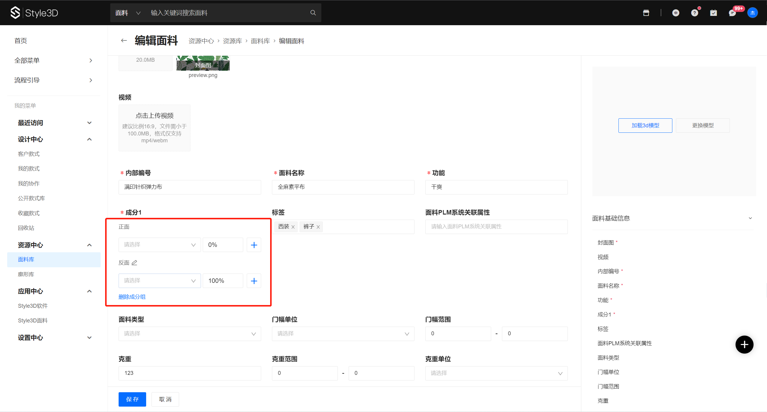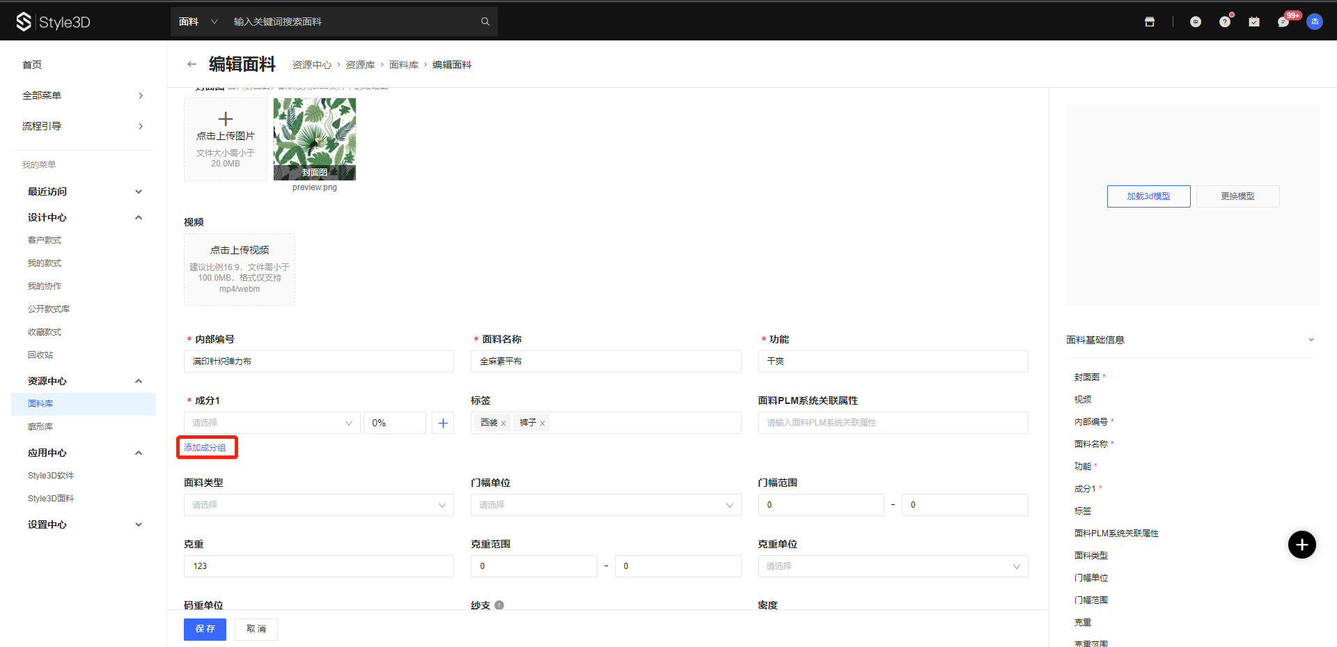 在面料编辑界面,添加成分组,可以分别录入正反面不同成分