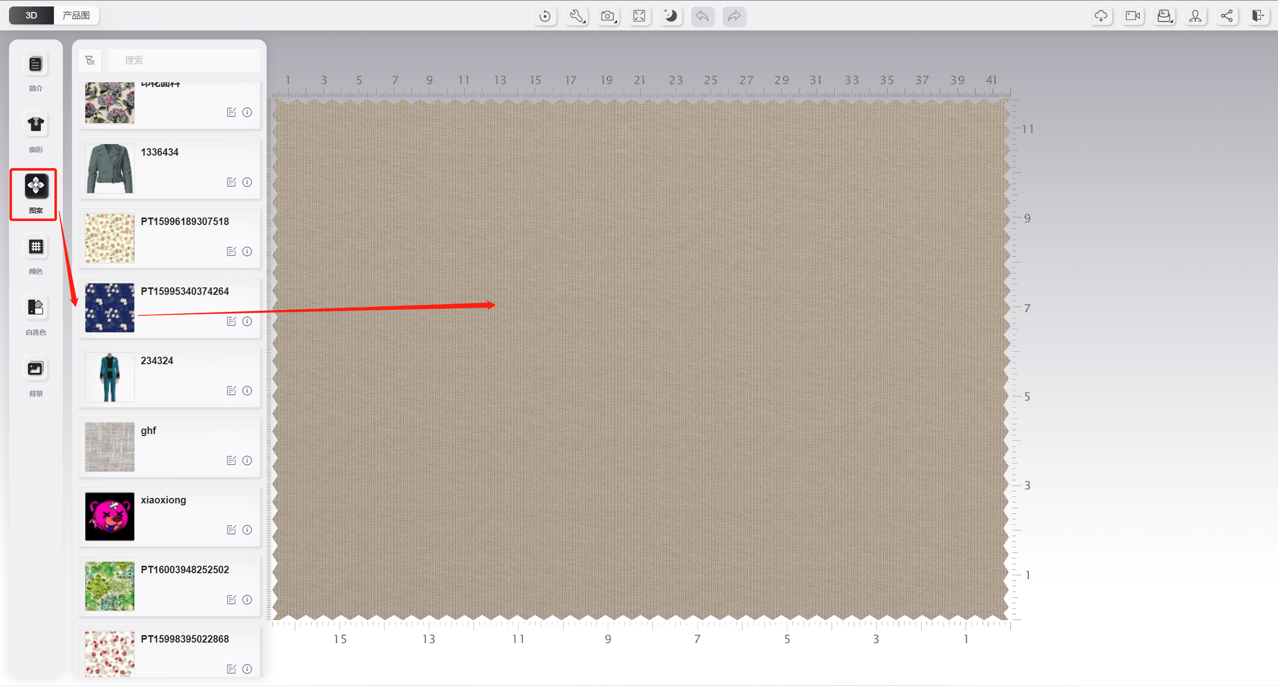面料库找到需要叠加的纹理面料,打开详情页,左侧选择图案(图案默认来源于资源中心图案库),鼠标拖动图案至面料上