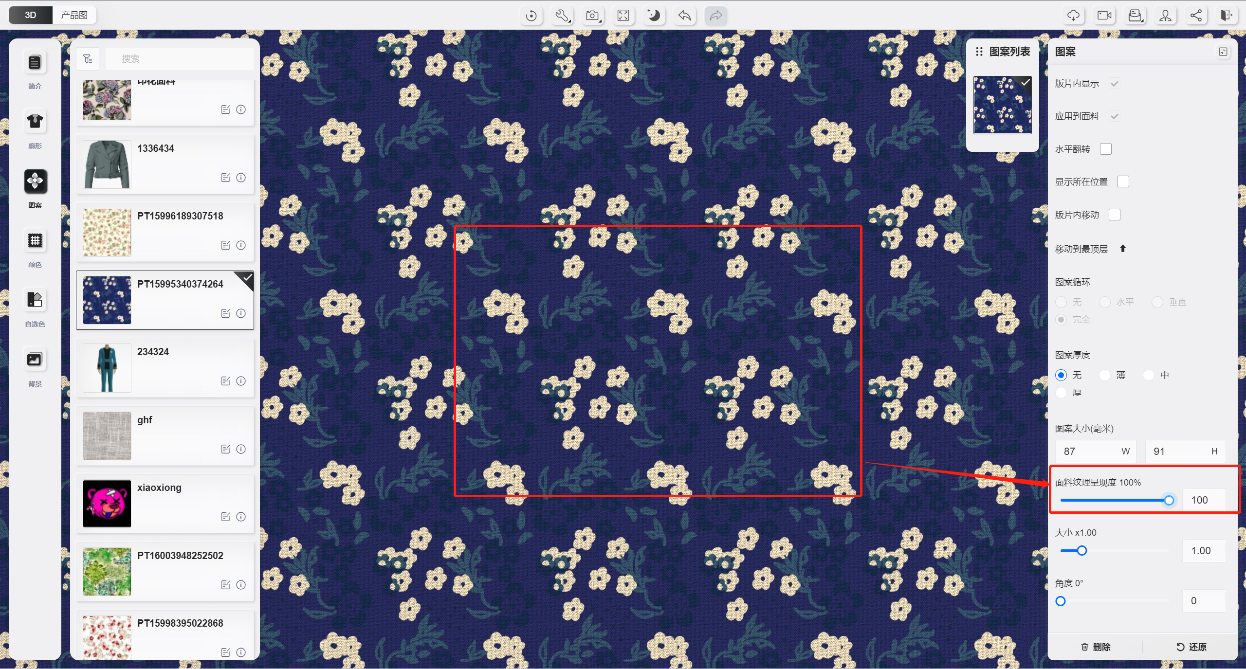 图案鼠标拖拽至面料上后,在右侧调整【面料纹理呈现度】,数值调整到100后,详情页会显示处底纹叠加画稿的效果