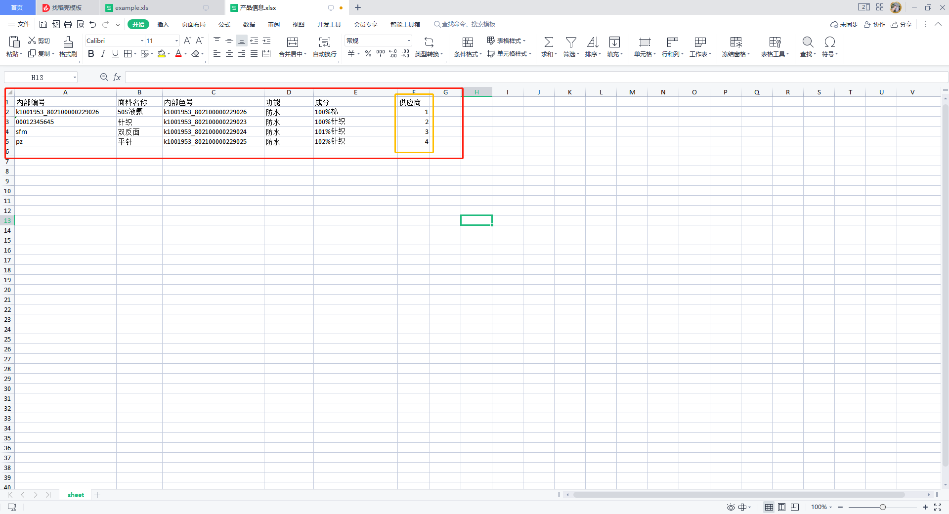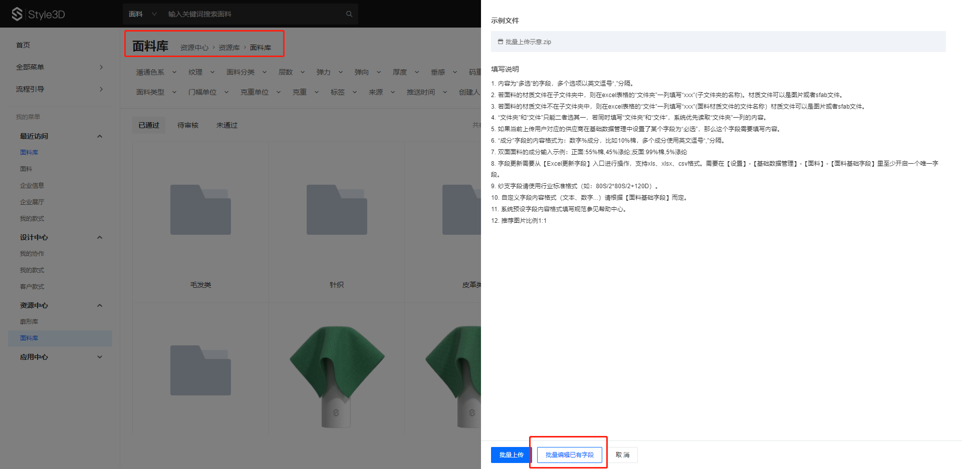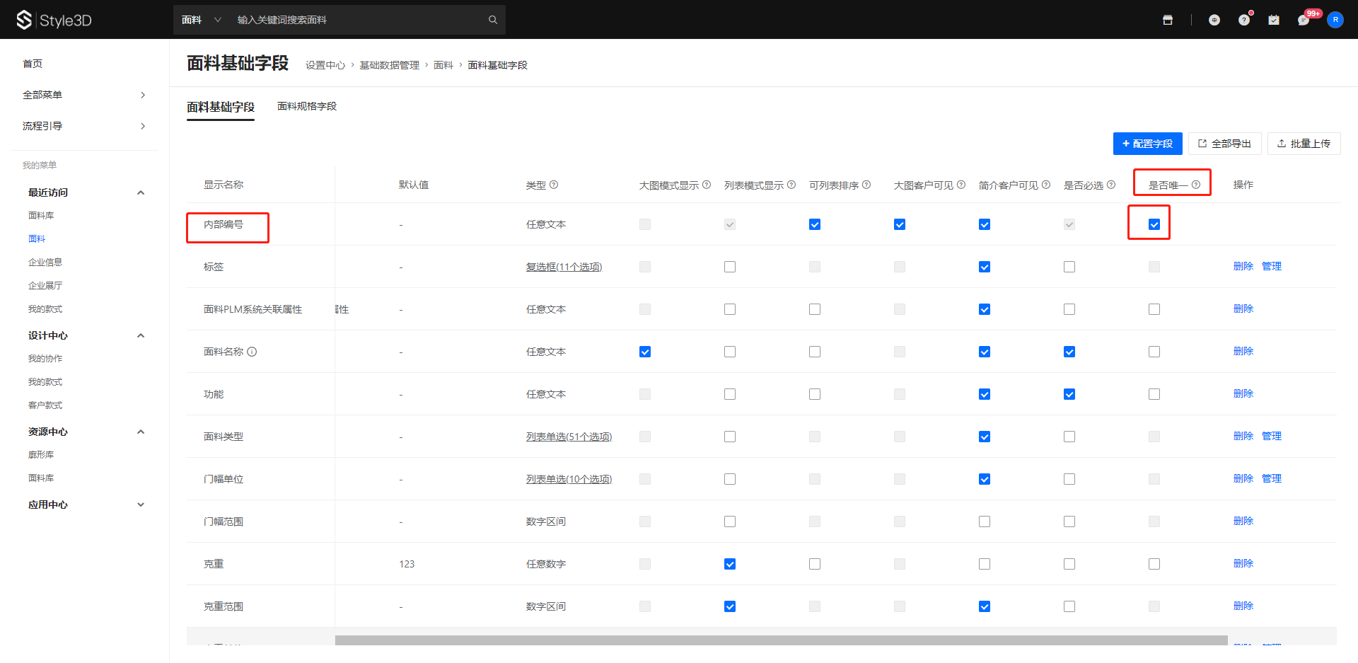 首先确认面料基础字段中有唯一字段(用于对应内容),一般使用内部编号