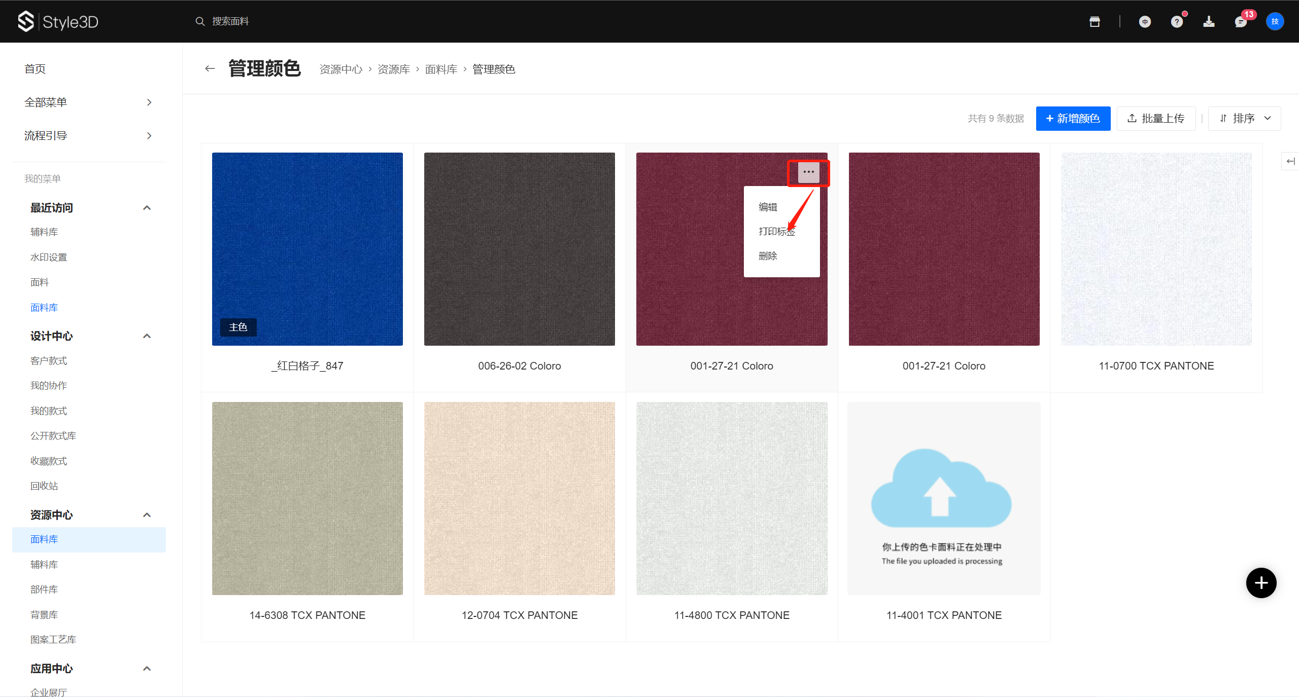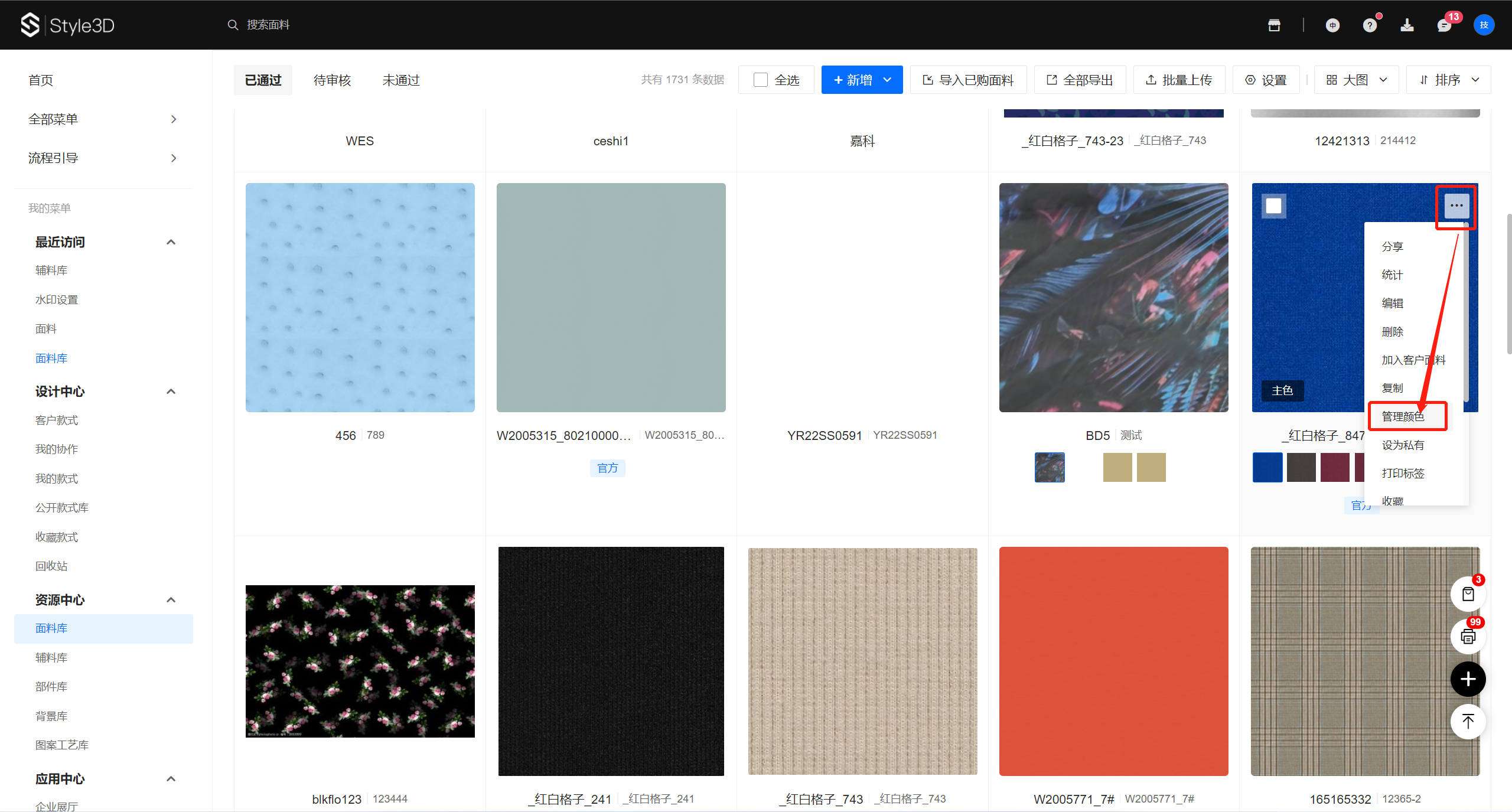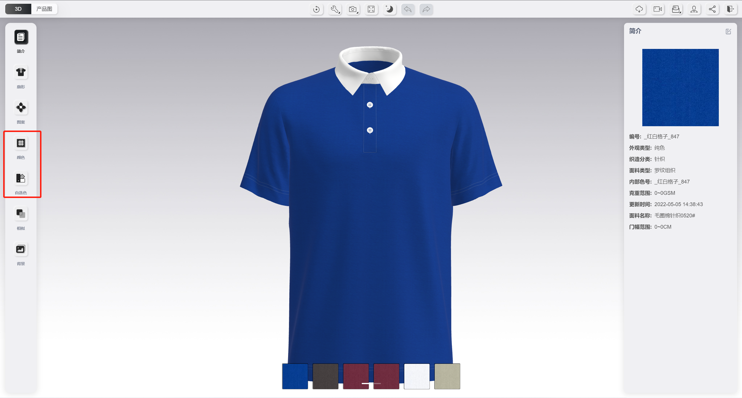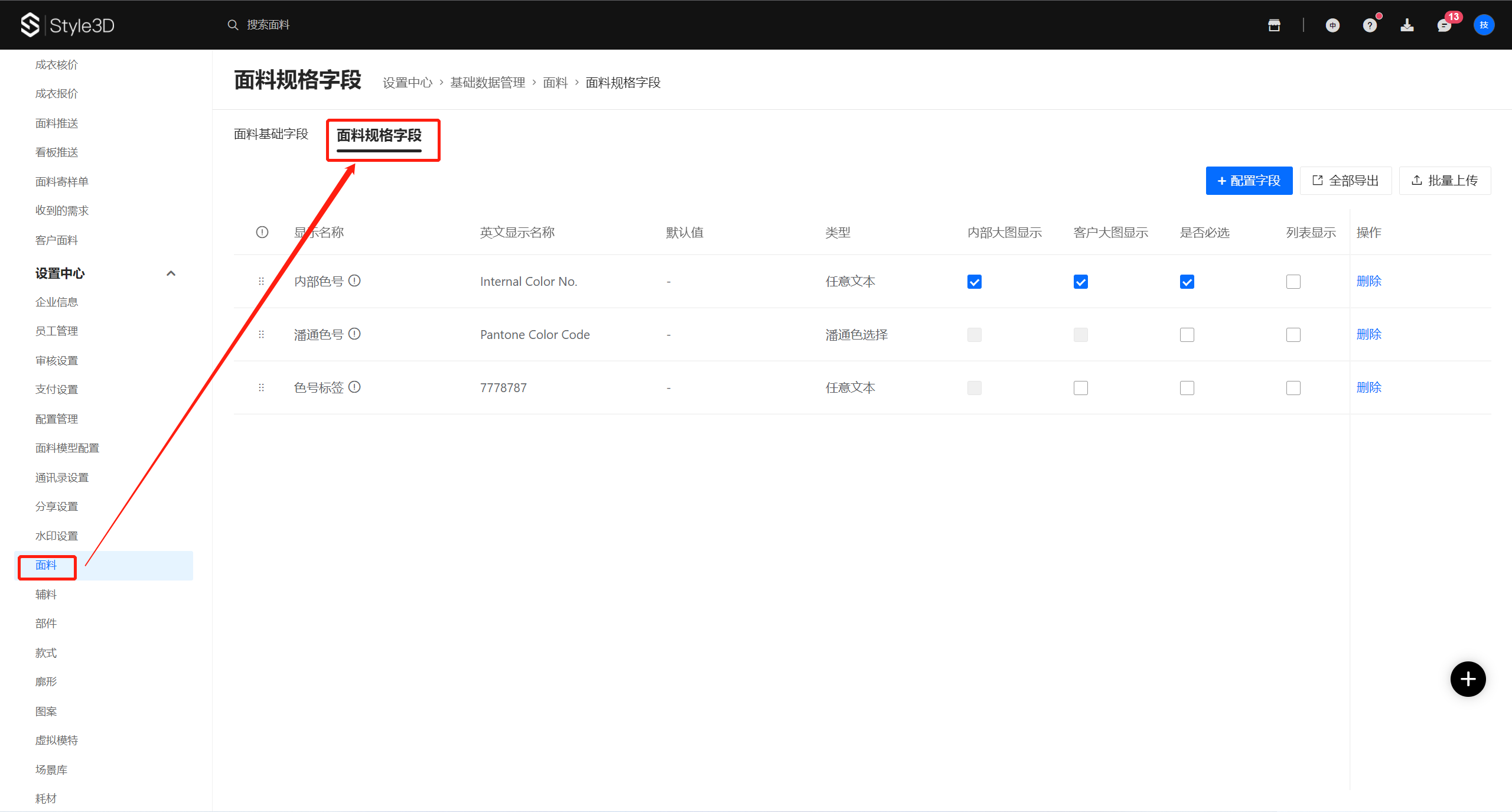 颜色主要作用:大图下面会显示缩略图,详情页可查看款式上身效果,关联的单个颜色可单独打印标签,可单独设置【面料规格字段】,能够独立生成sfab文件并在Style3D Studio中打开使用