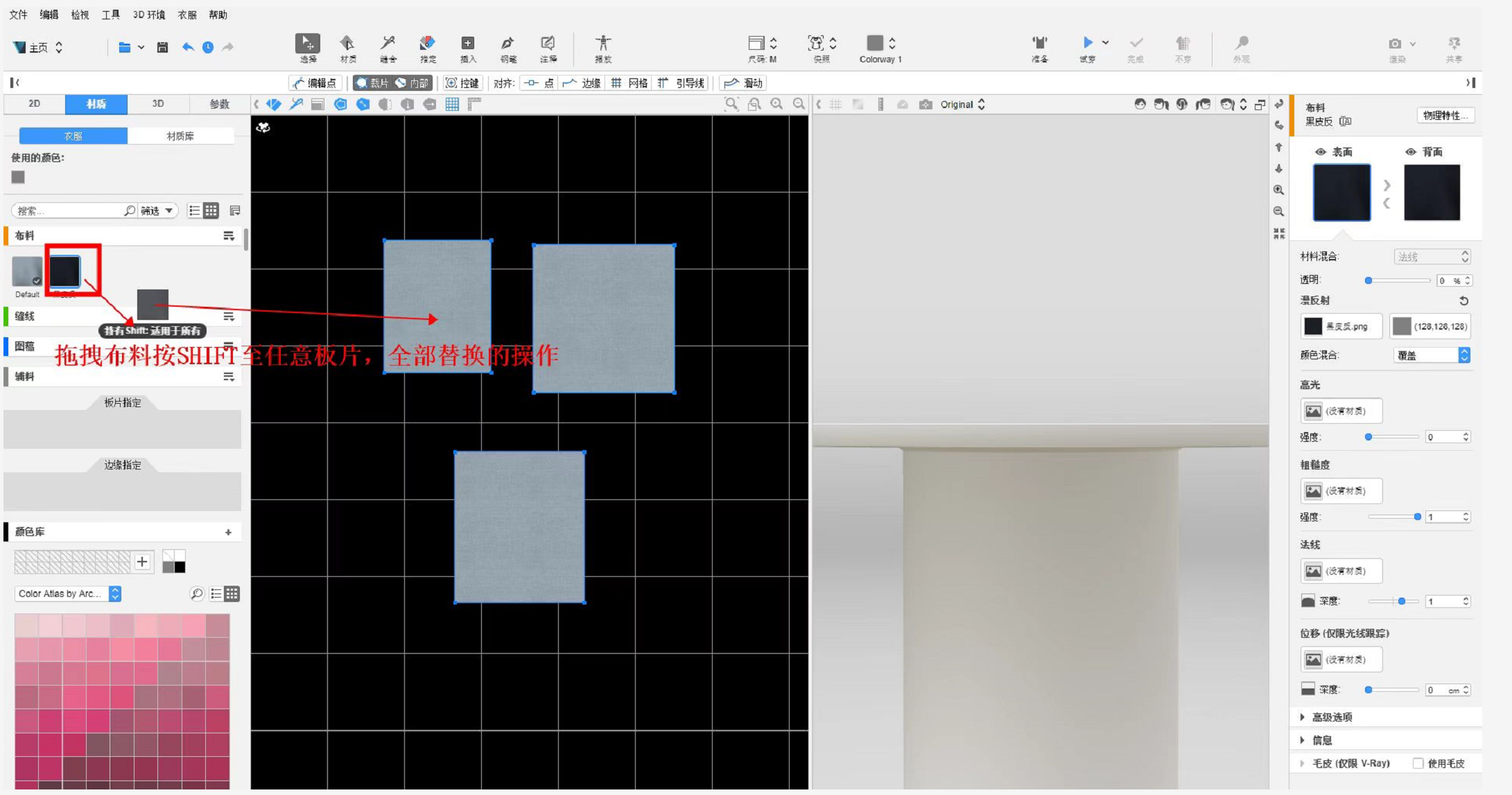 有两种方法:一、平台上所有版片织物设置为同一个材质组名称;二、第三方软件设置所有面料为同一材质