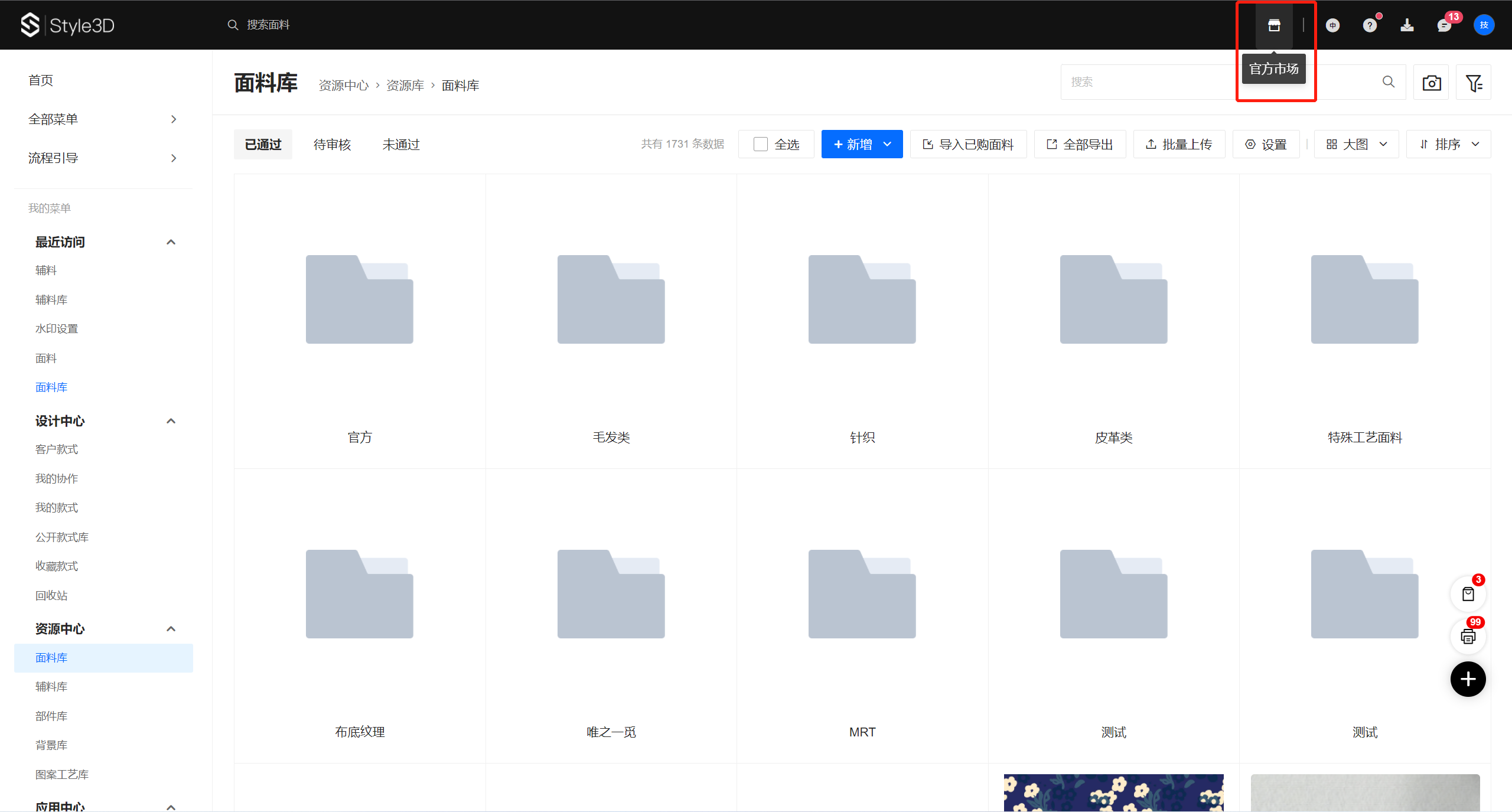 登录平台详情页,右上角点击功能图标,进入官方市场