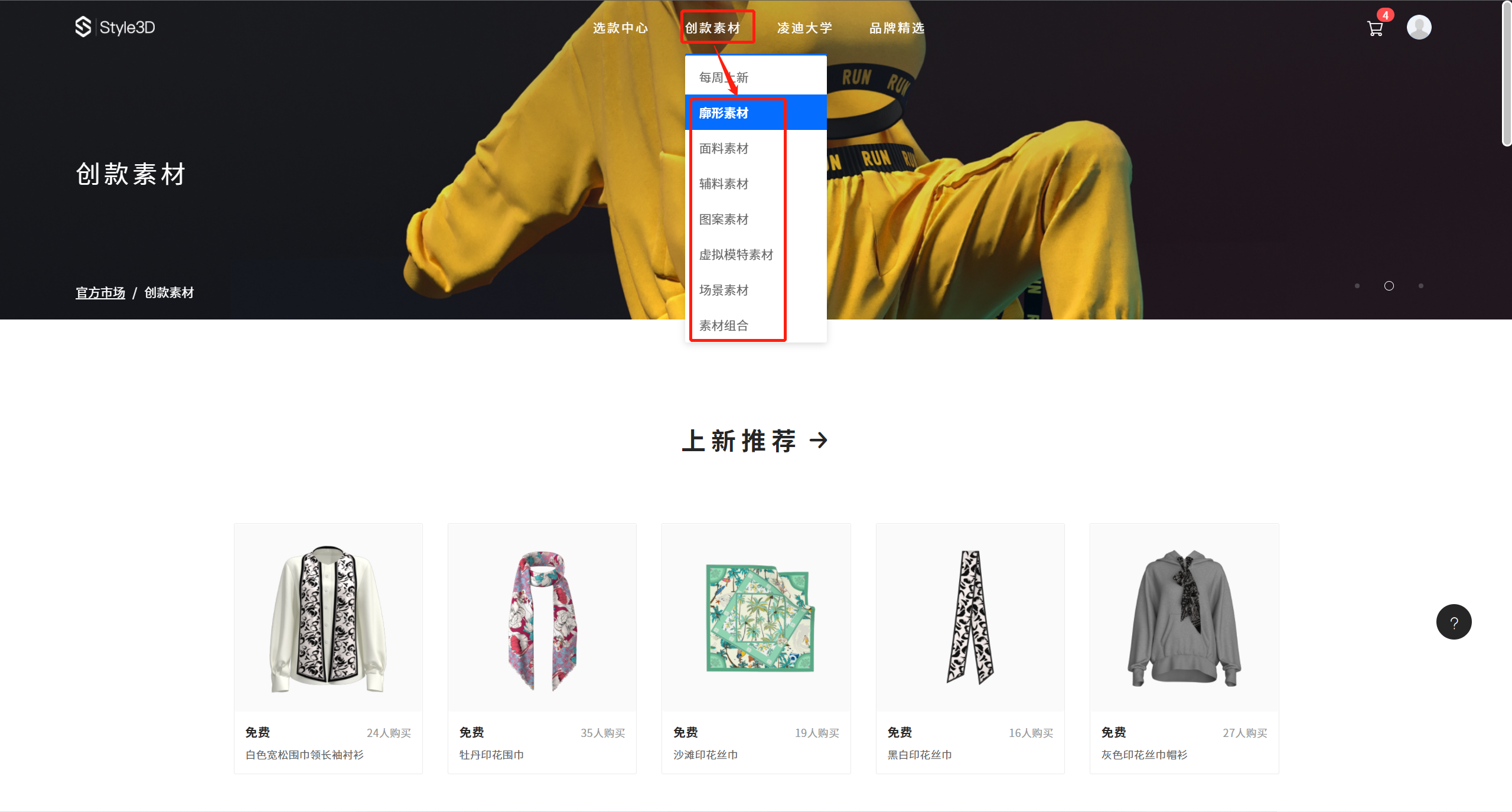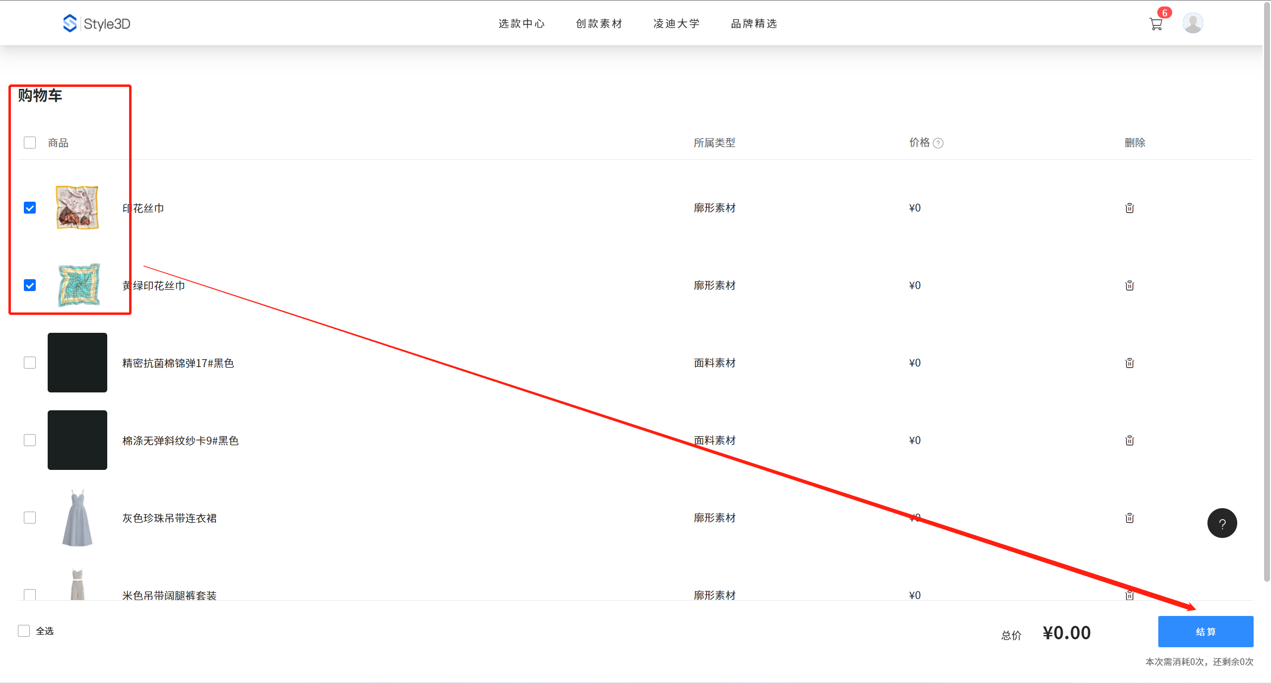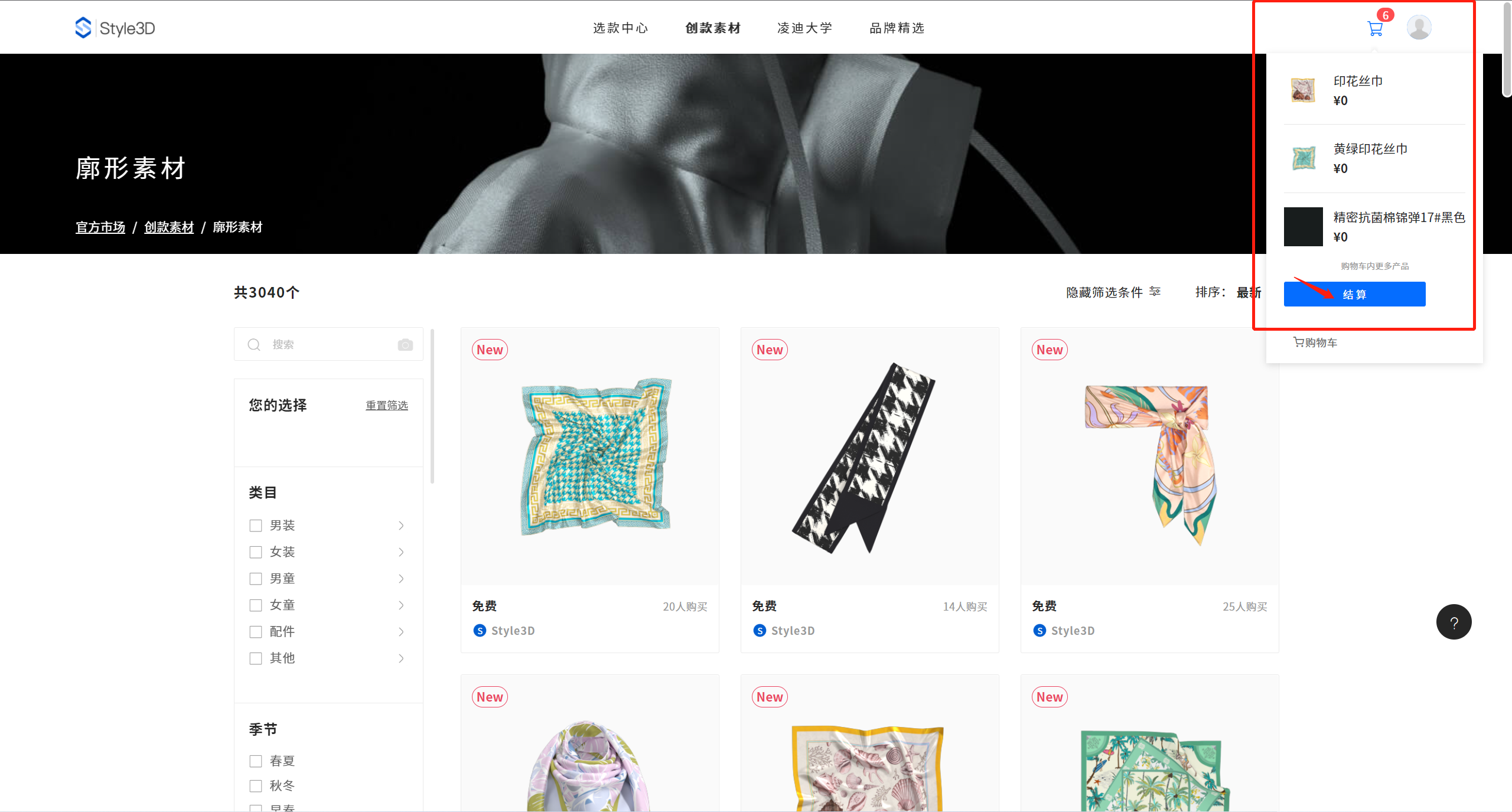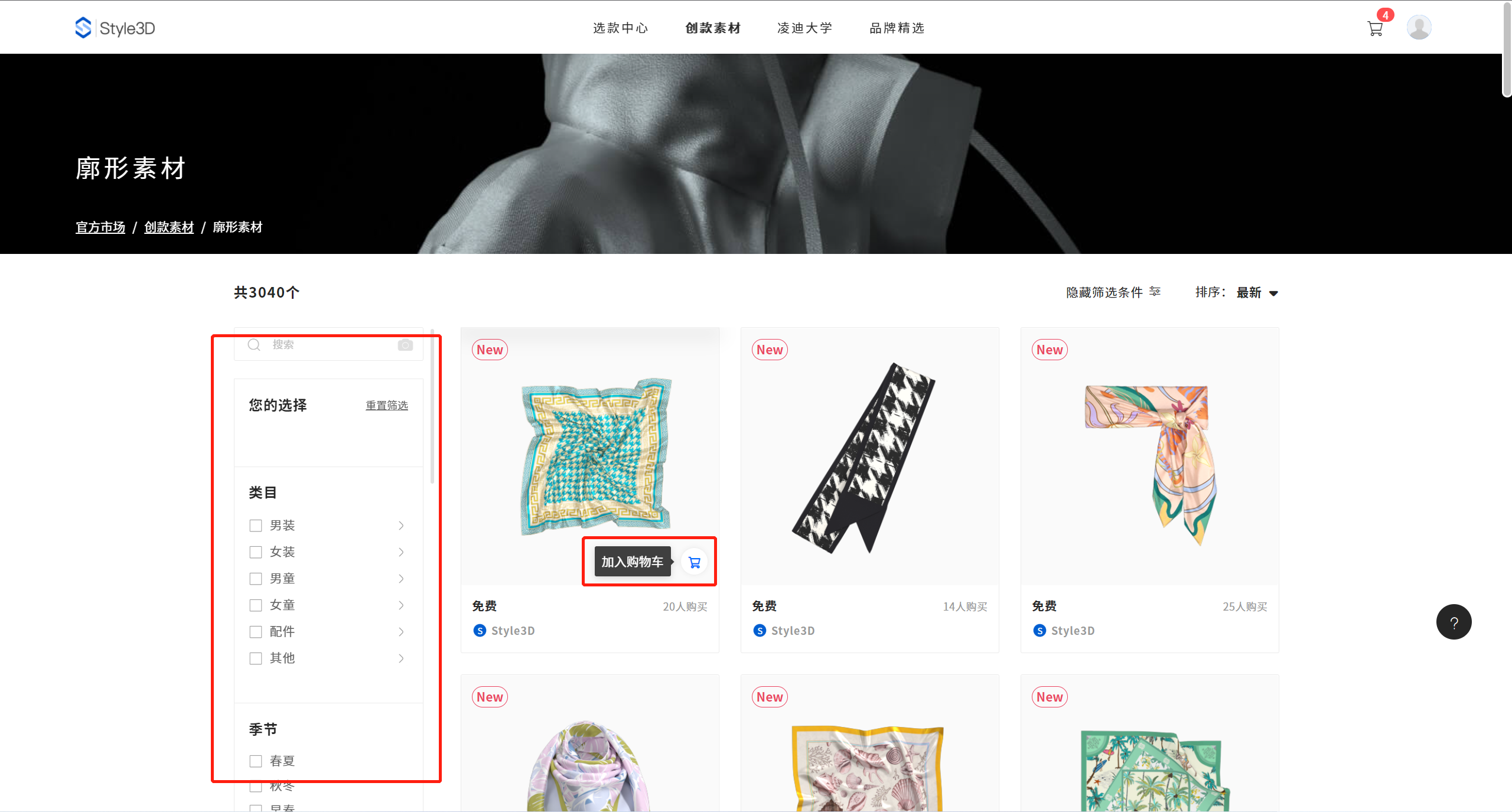 可以通过左侧的【搜索及筛选】查找需要的素材内容,点击加入购入车,在右上角选择购物车素材进行结算