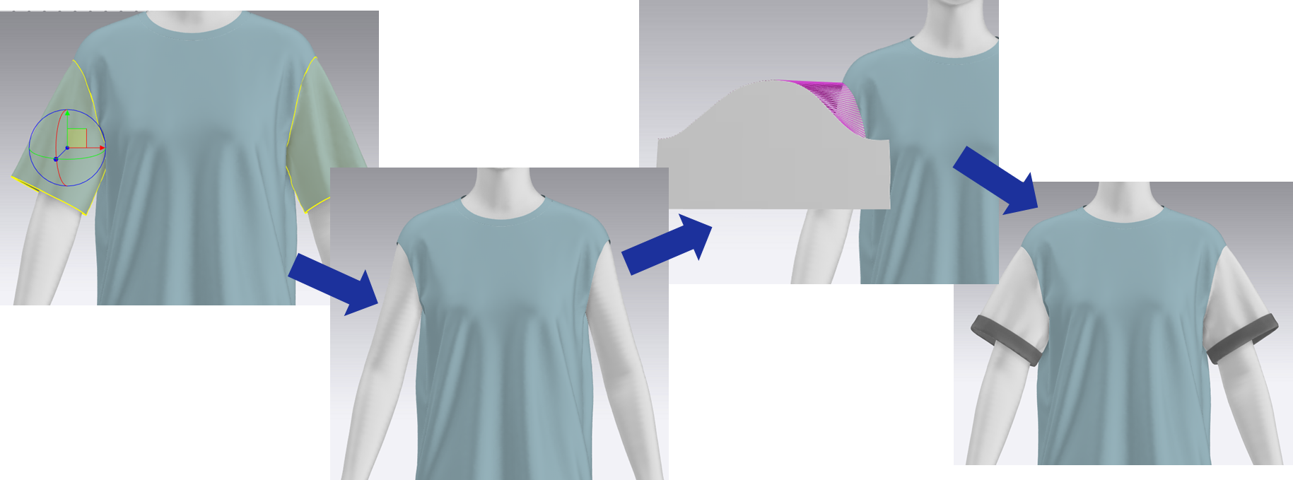 2.更换部件。以袖子为例,首先将原基础款工程另存一份,以将要替换的部件为其命名。选中基础款的袖子,如果新添加的袖子与基础款板片较为接近,可以直接在原板上进行修改,再重新调整。若板片相差较大,则需要将原来的袖子删除,将新的袖子缝在大身上,调整造型。(注意冷冻的部分不能解冻。)