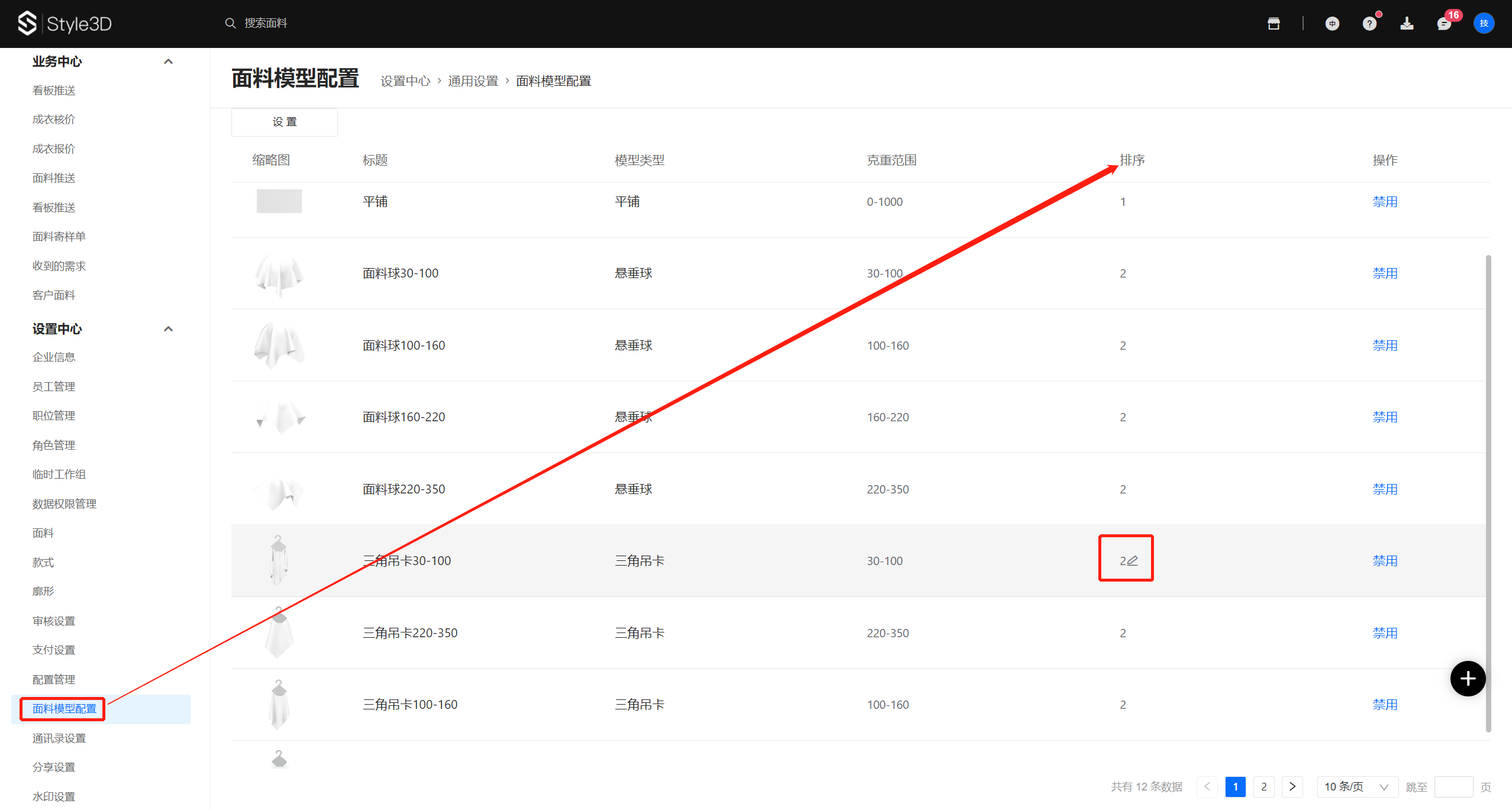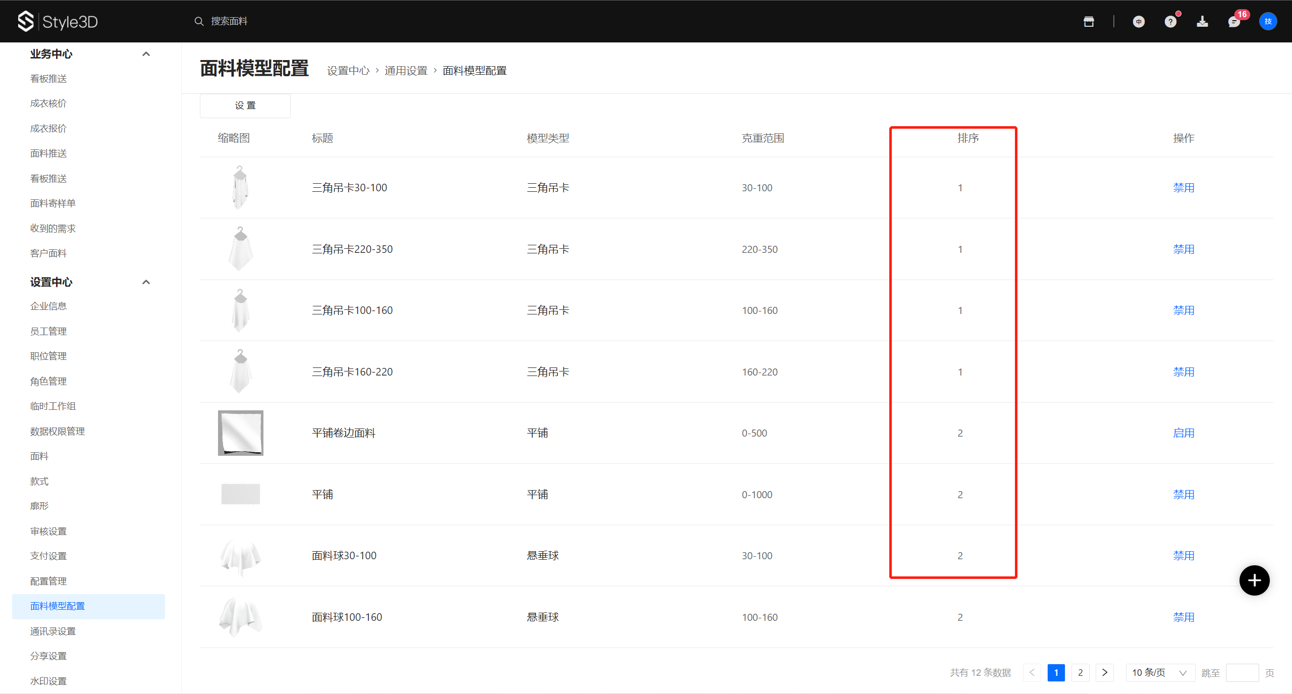 如对面料模型需要调整默认展示顺序,可在【设置中心-通用设置-面料模型配置】进行排序设置,数字"1"即代表排在首位模型,依次类推编号即可,可手工把需要排在第一位的模型数字更改为"1"回车键确定即可,每个模型只需更改一个编号即可,其它克重会自动跟随变动