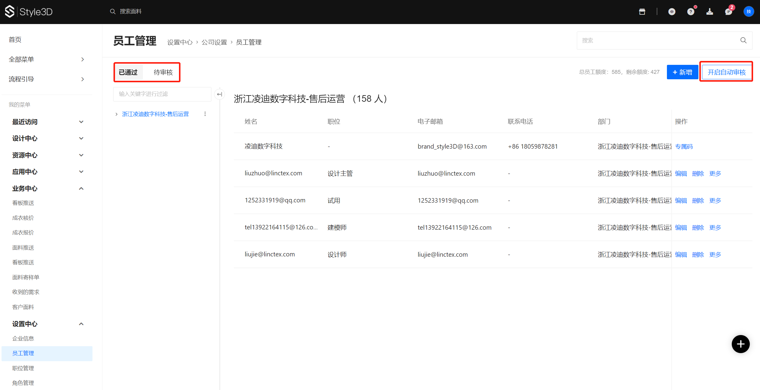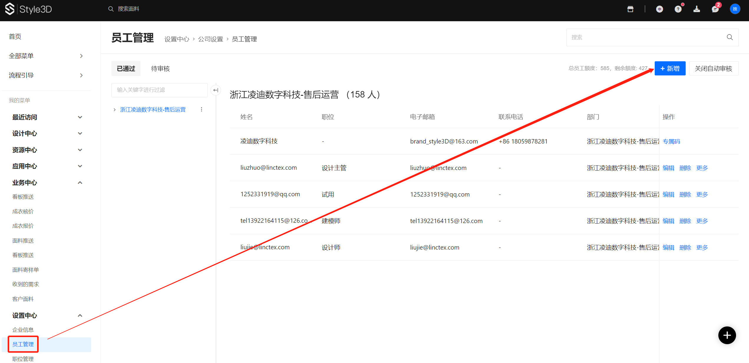 一、用企业管理员账号登录平台,平台登录网址:www.style3d.com,点击【全部菜单-设置中心-员工管理】,选择右上角【新增】