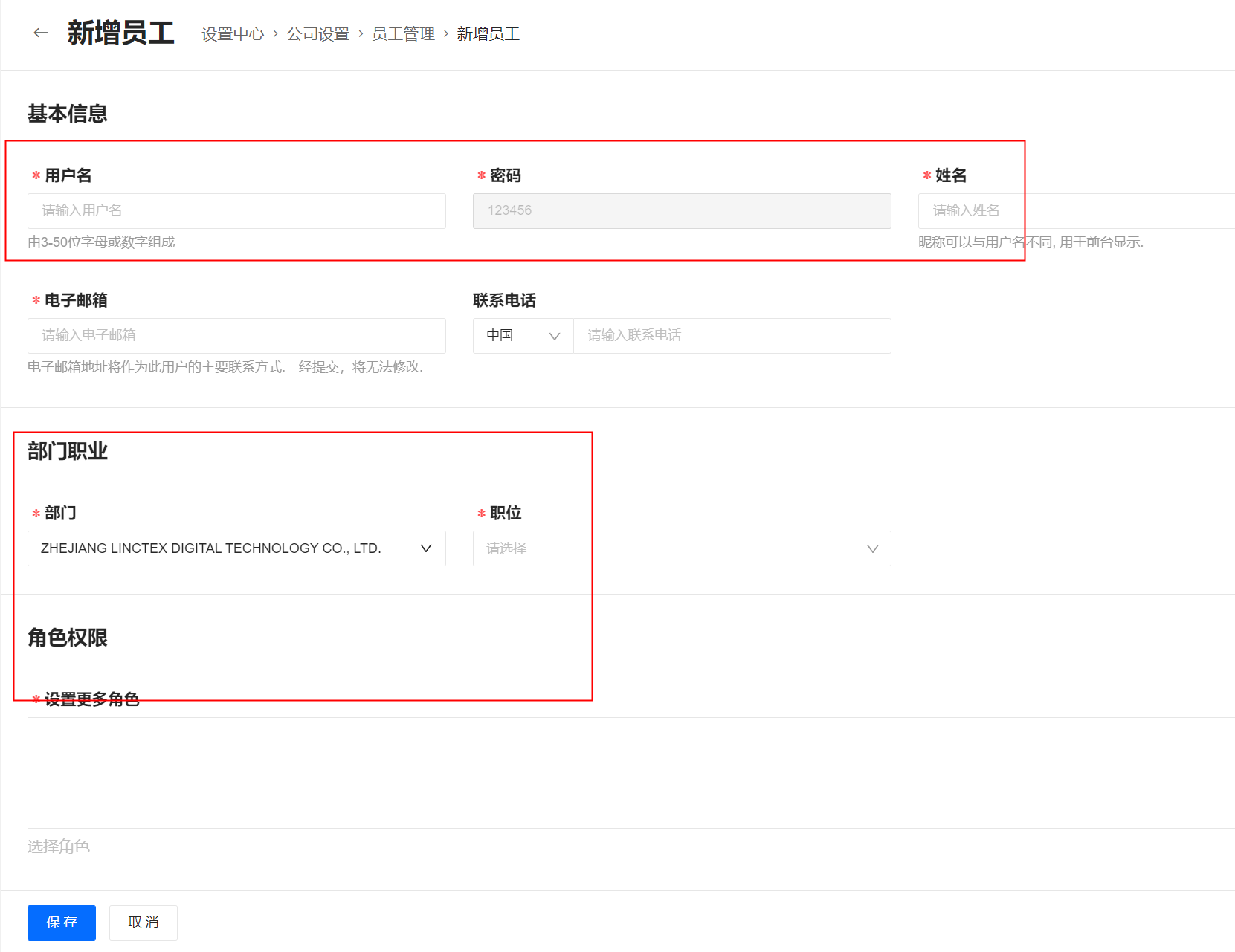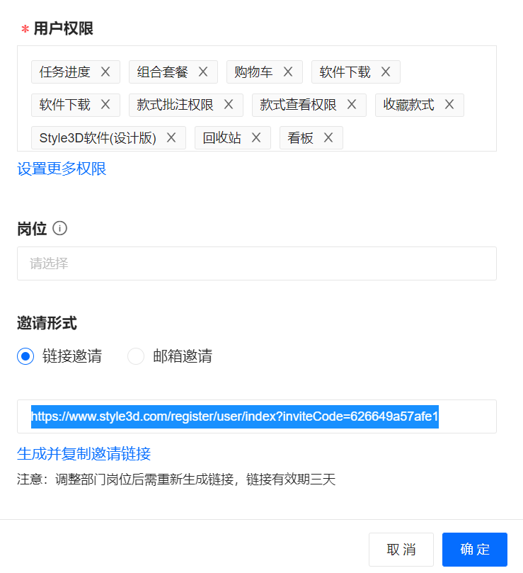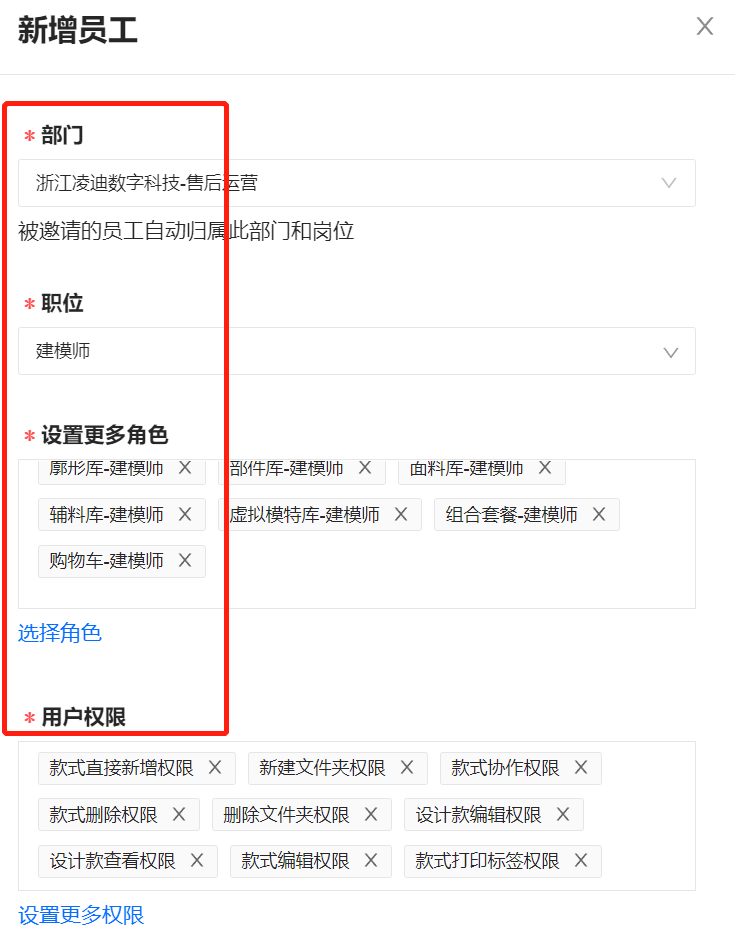 1.直接邀请员工,选择【部门及职位】,对应的【设置更多角色及用户权限】会自动生成,角色和用户权限也可单独进行设置