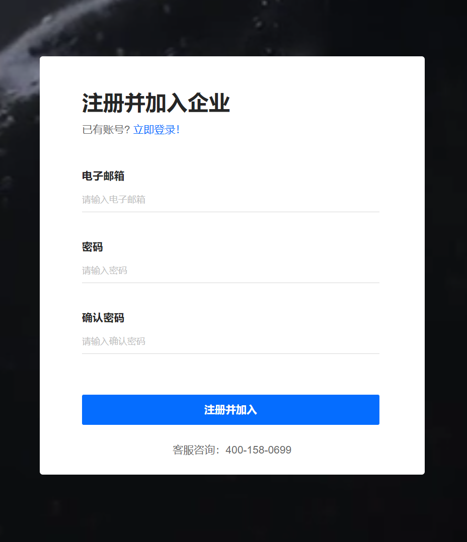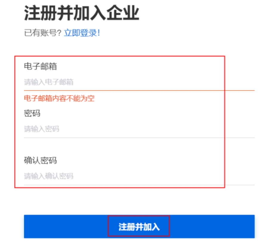 - 链接邀请,点击【生成并复制邀请链接】,网页链接发给对应的员工即可,新员工输入账号/密码即完成账号注册,注意:账号必须用真实的电子邮箱,且后期不支持修改