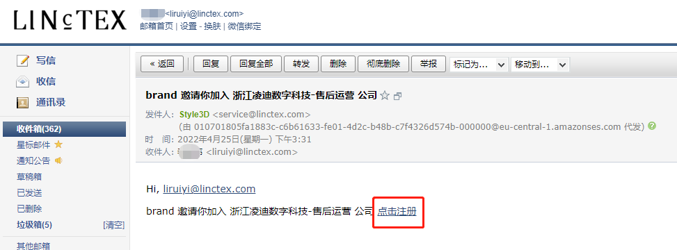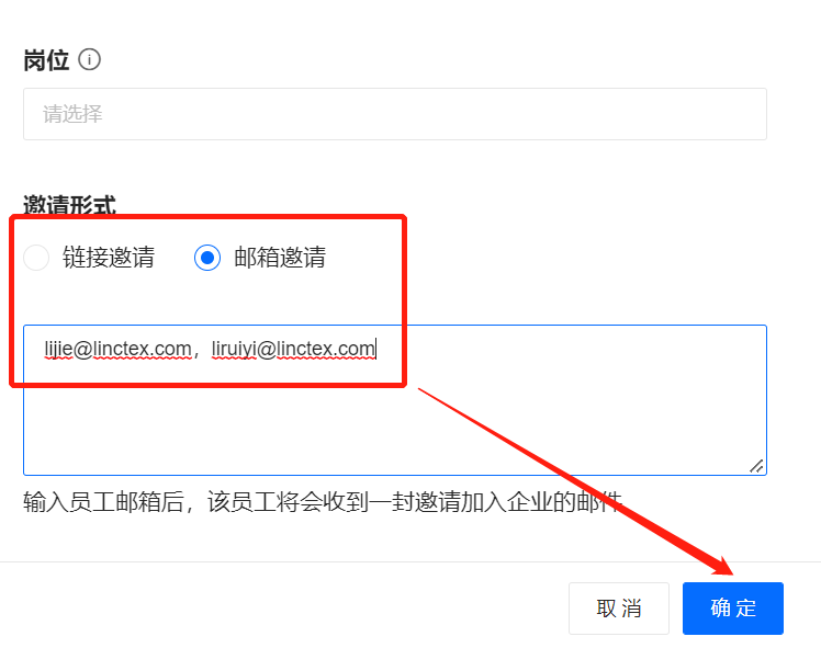 - 邮件邀请,需输入员工邮箱,如有多位同岗位员工,可直接输入多个邮箱,点击确定,新员工打开邮箱,【点击注册】输入账号/密码即完成账号注册,注意:账号必须用真实的电子邮箱,且后期不支持修改