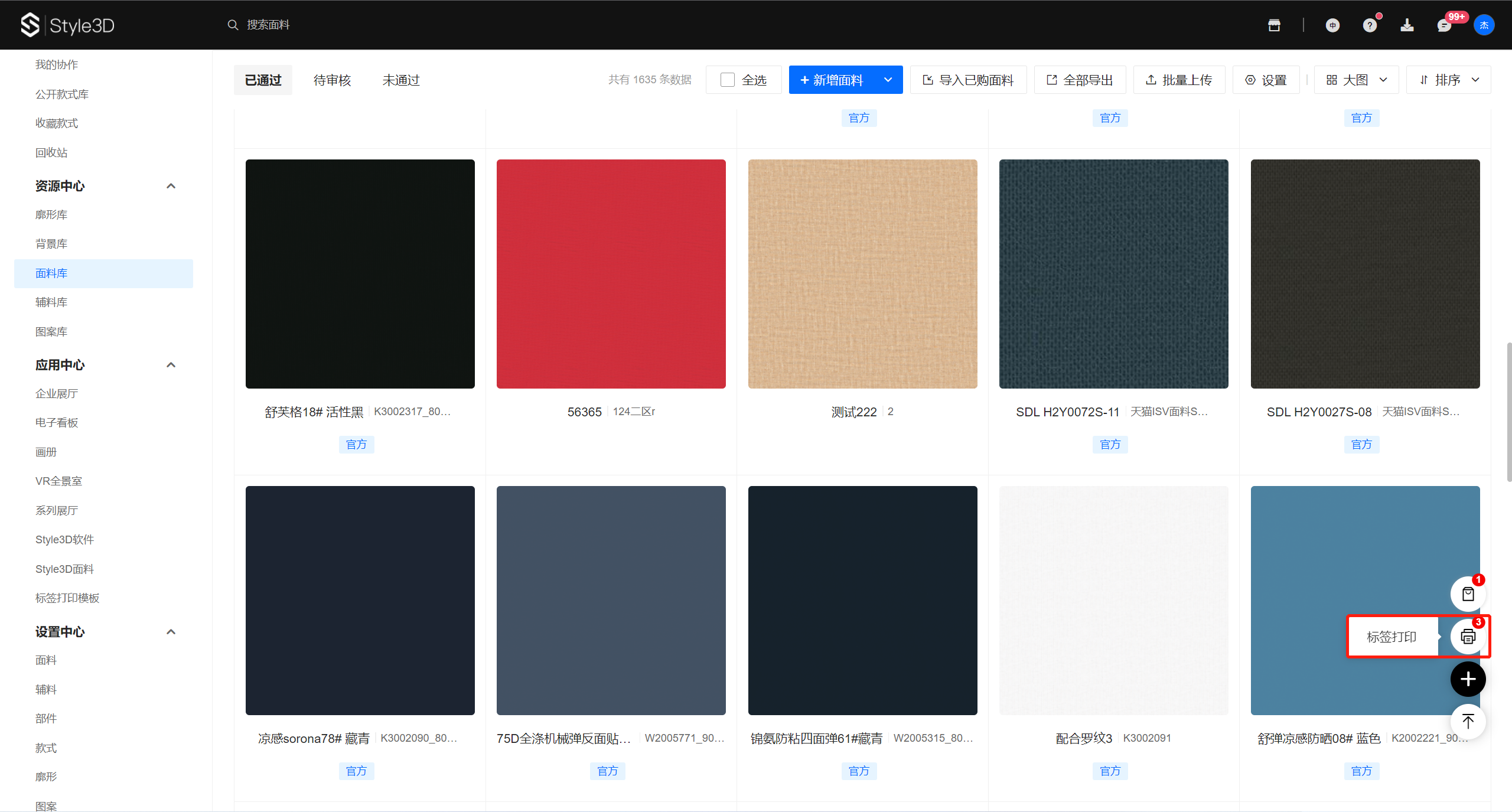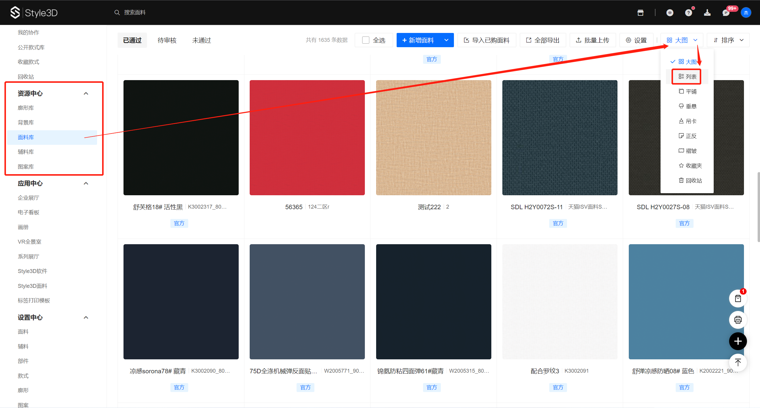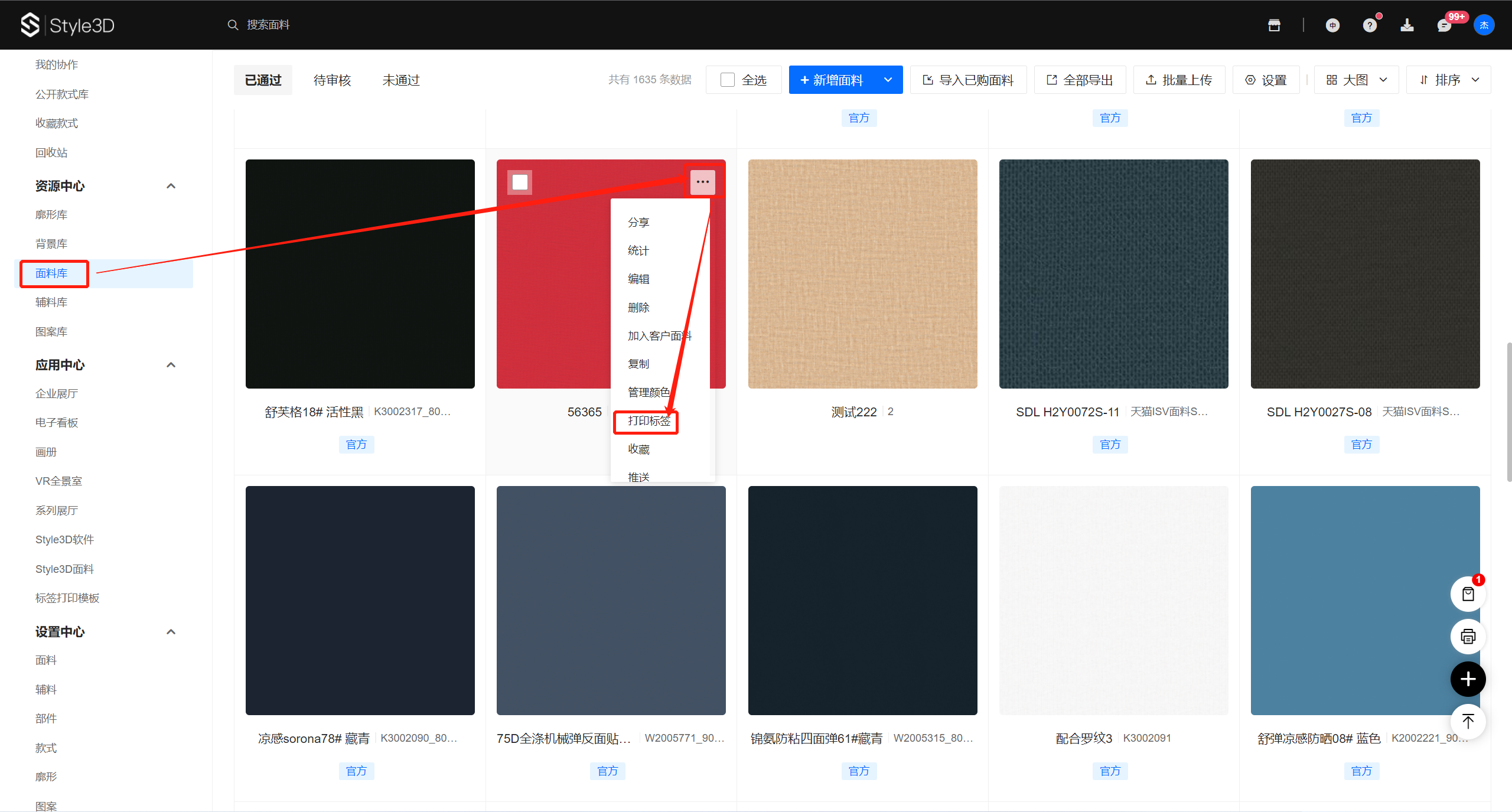 选择需要标签打印的面料/款式,点击【大图】切换为列表模式