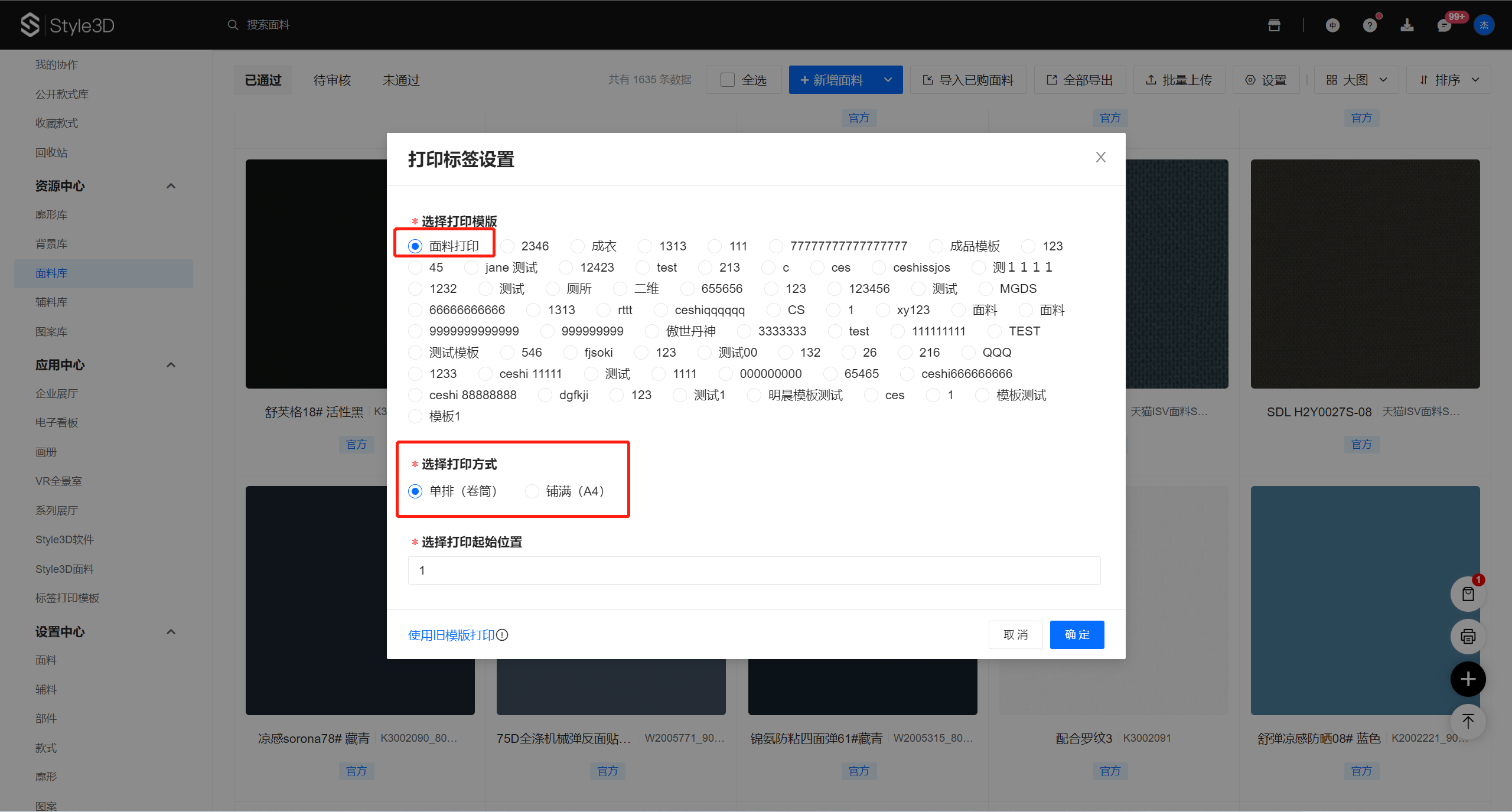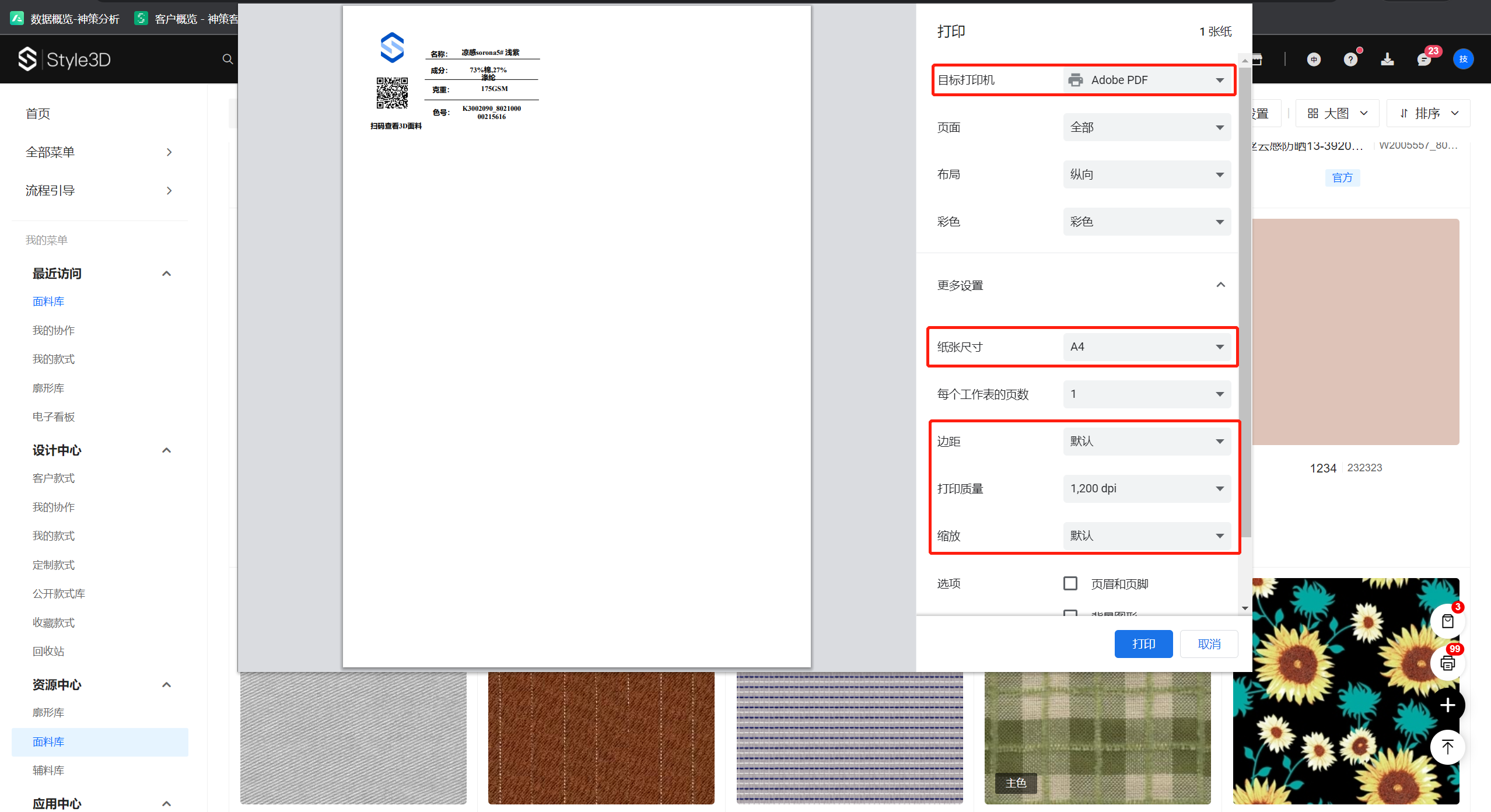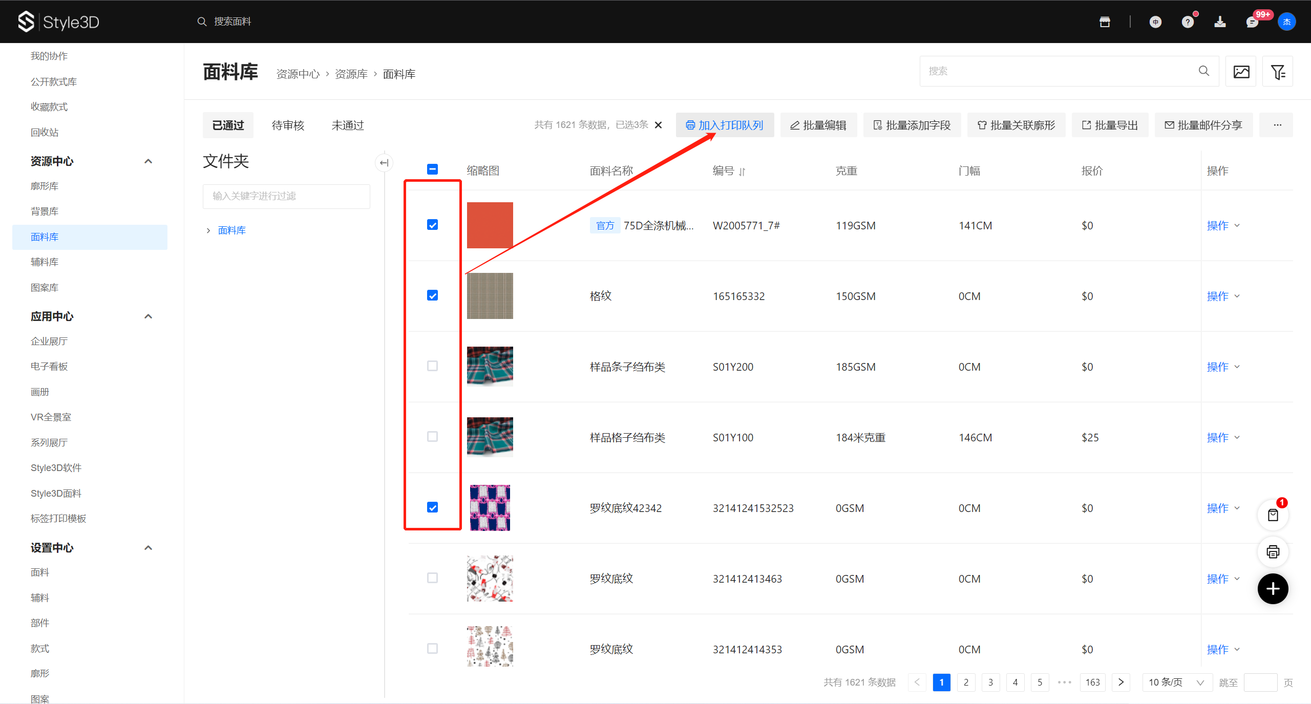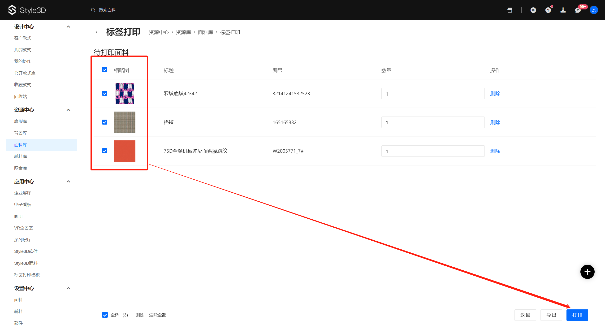 加入成功后,右下角会显示添加面料/款式的数量,点击查看全选即可打印
