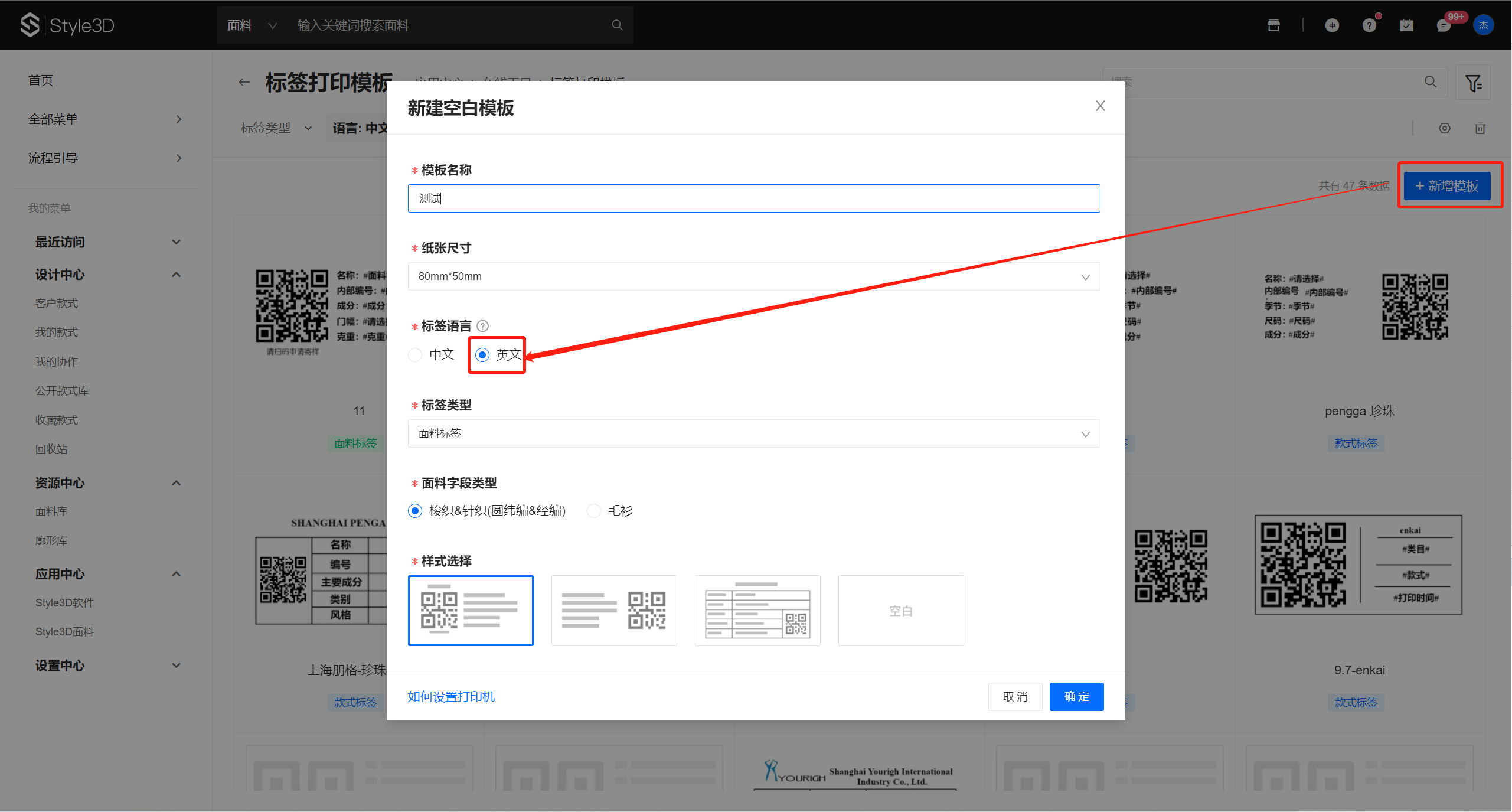 需要单独制作一个英文版标签打印模板,应用中心>在线工具>标签打印模板,点击新增模板,模板标签语言设置为英文