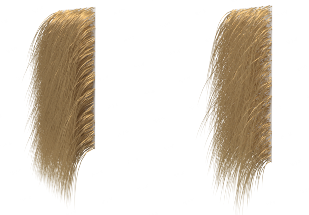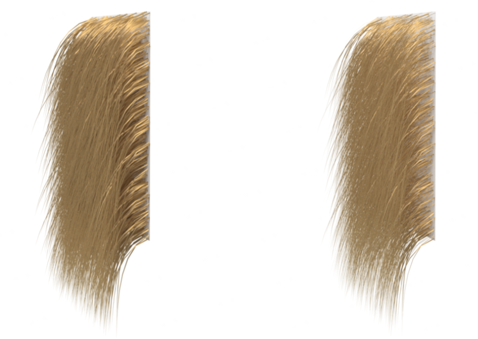 重力: 调整毛发在重力作用下的不规则效果。数值较高会导致重力对毛发的影响更加不规则;相反,较小的数值则会使重力对毛发的影响更加均匀。*注意:该设置仅在弯曲值不为0时生效。