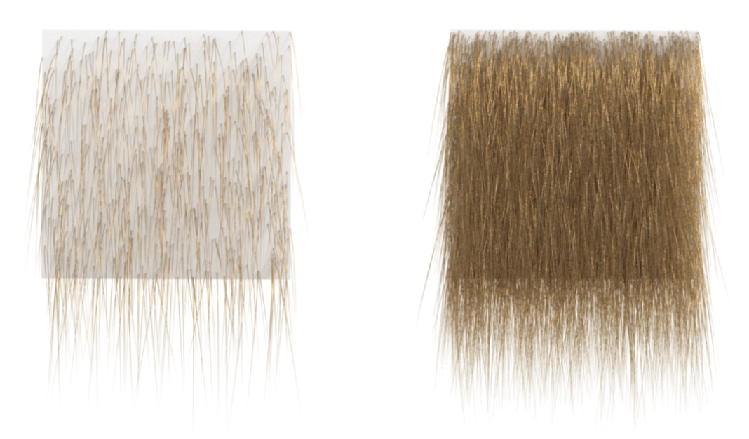 密度:指定毛发的密集程度。数值越高,毛发越密集;数值越低,毛发越分散。*注意:较高的密度会导致渲染速度变慢。