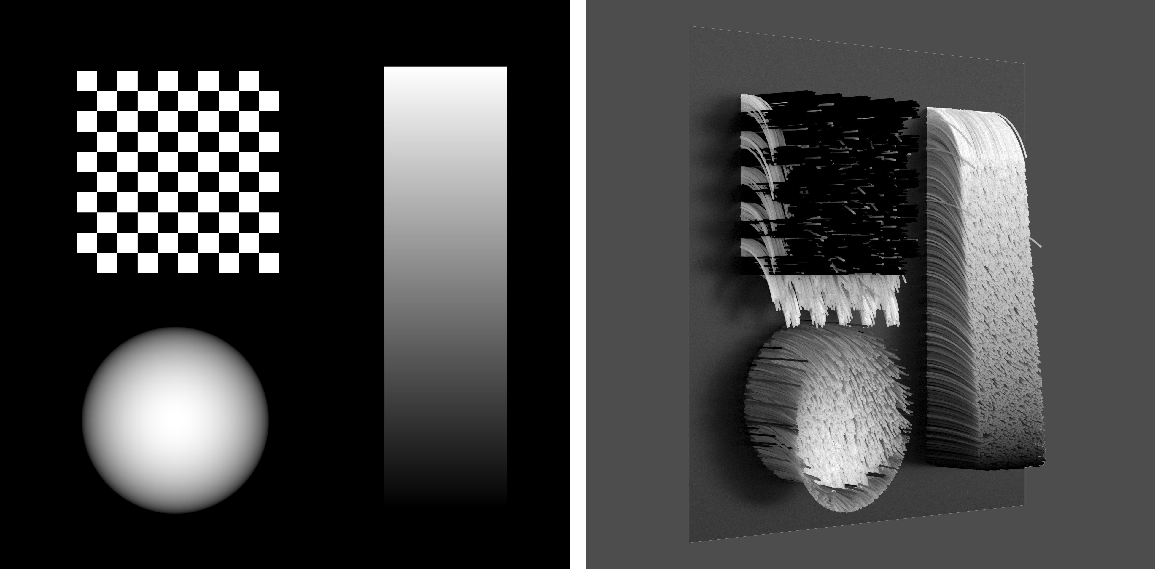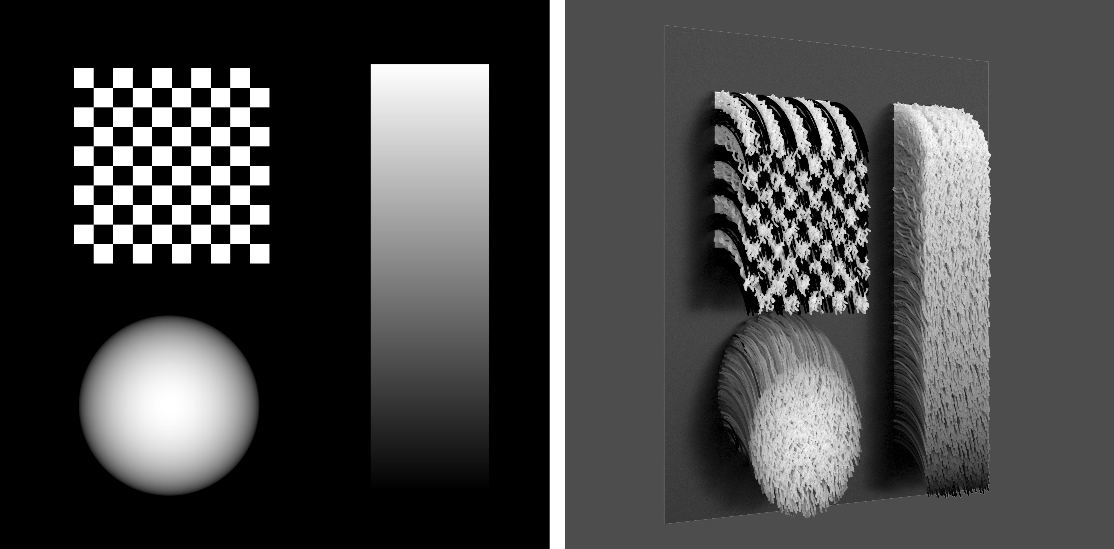 使用纹理贴图的亮度来控制毛发的卷曲效果(半径和数量)。在黑色区域,卷曲值(半径和数量)将被乘以 0,而在白色区域,卷曲值(半径和数量)将被乘以 1。