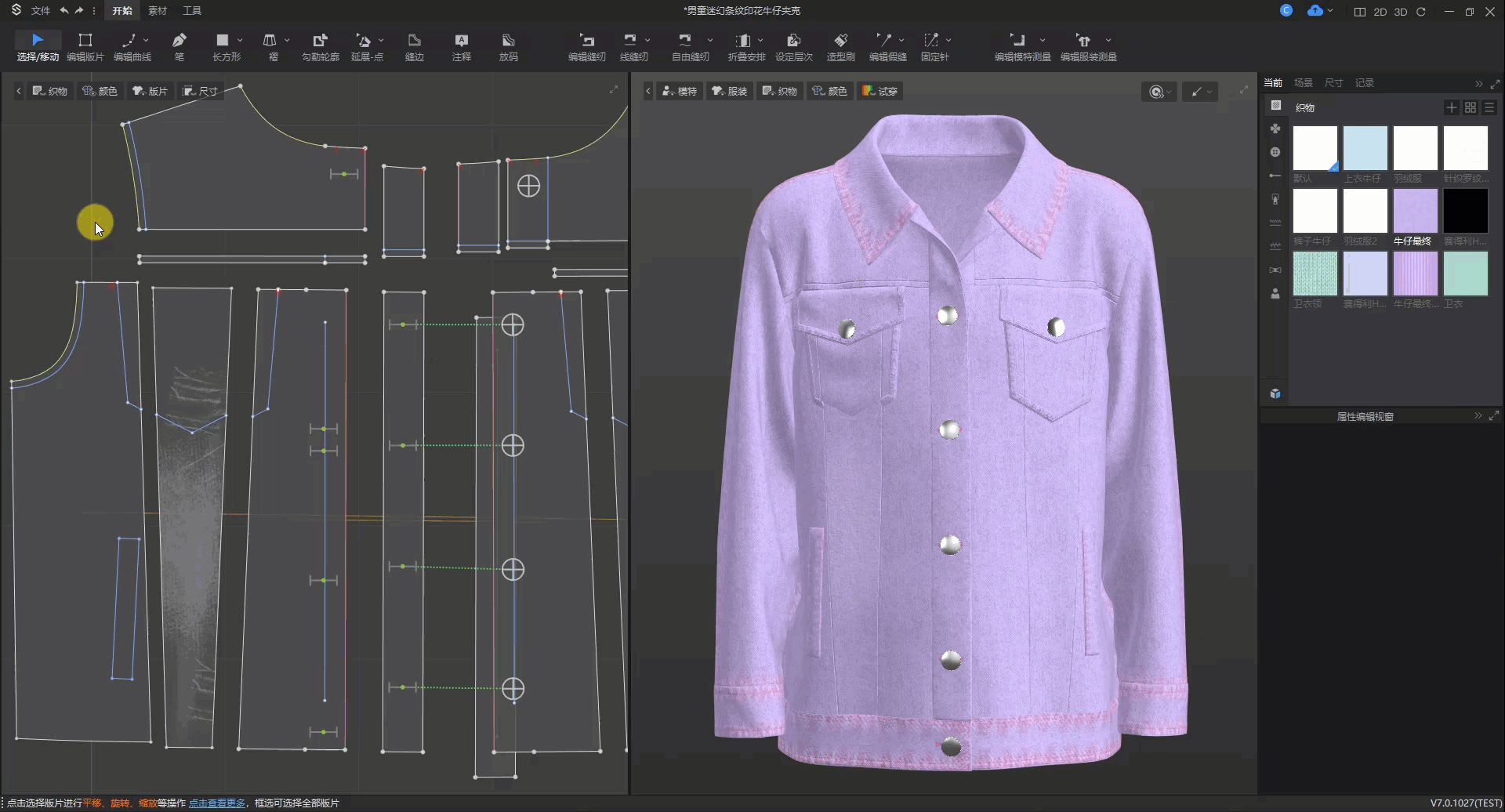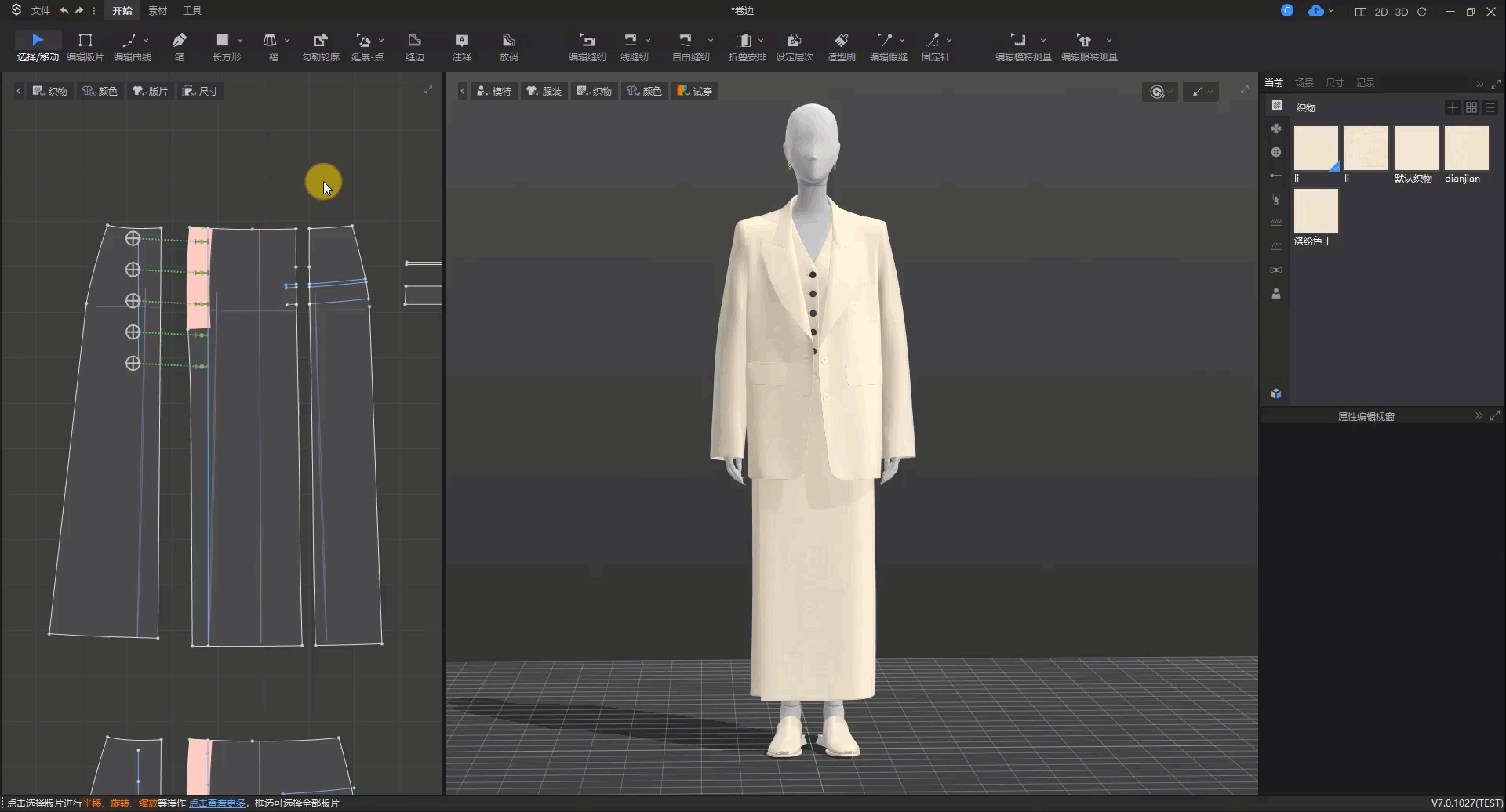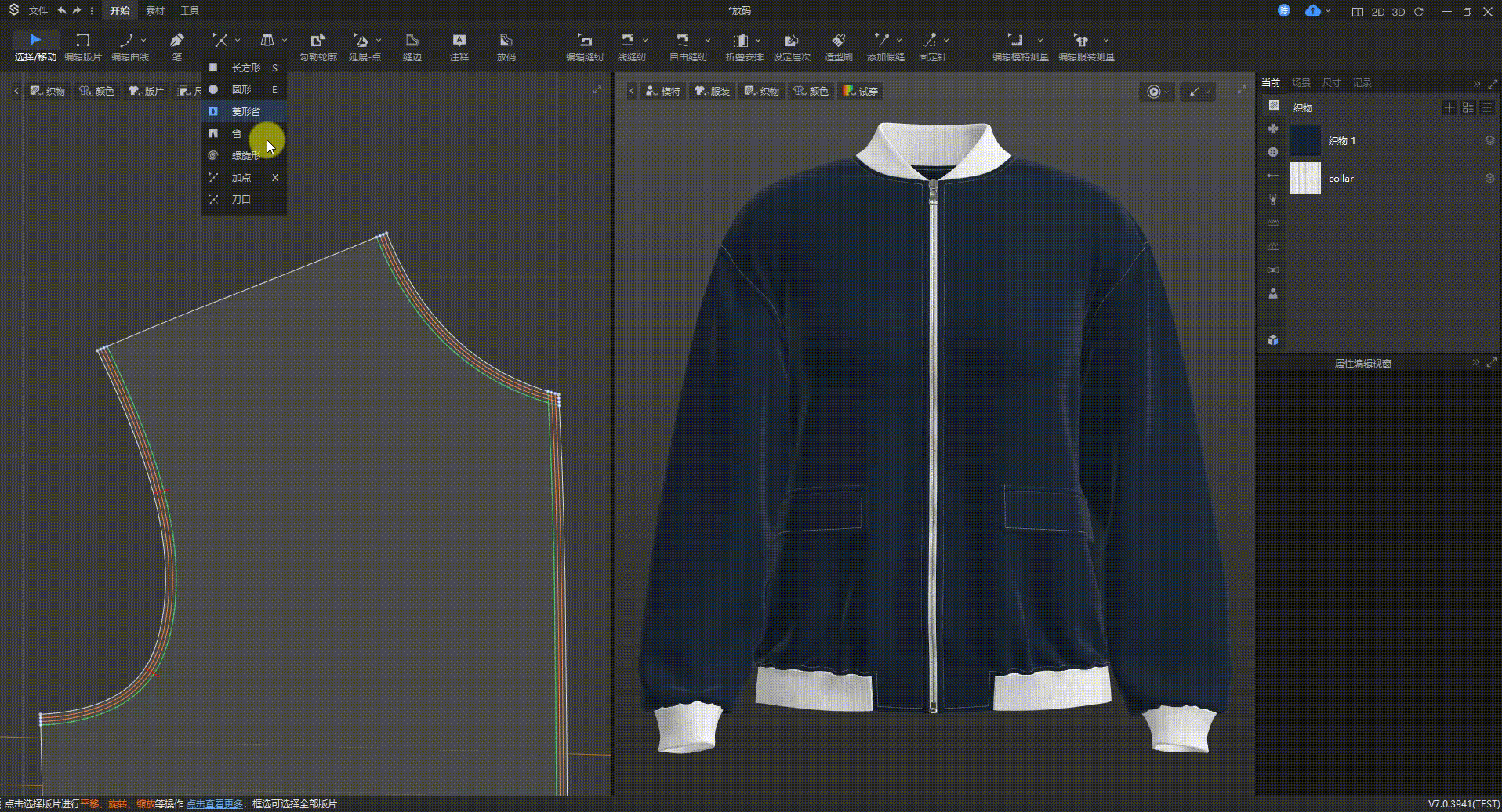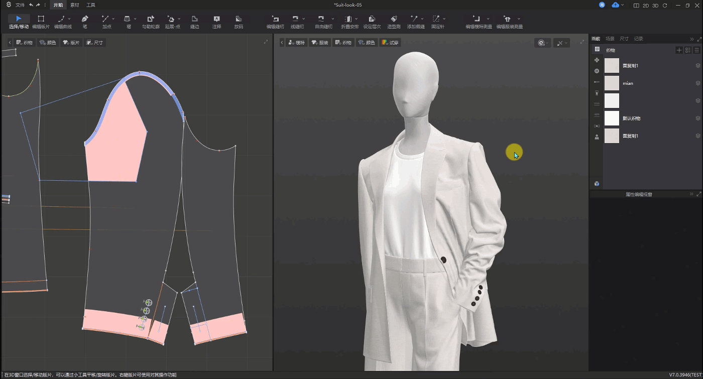 操作方法:选中内部线▶属性编辑视窗▶分割版片▶给不同部位设置不同织物▶修改厚度