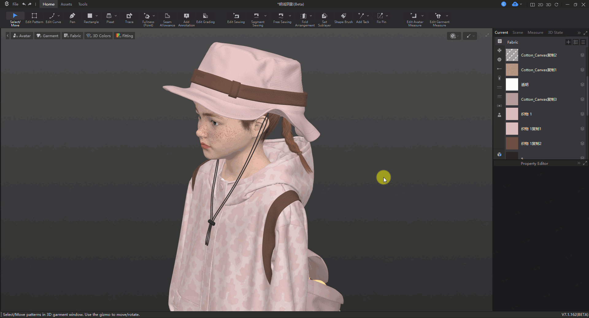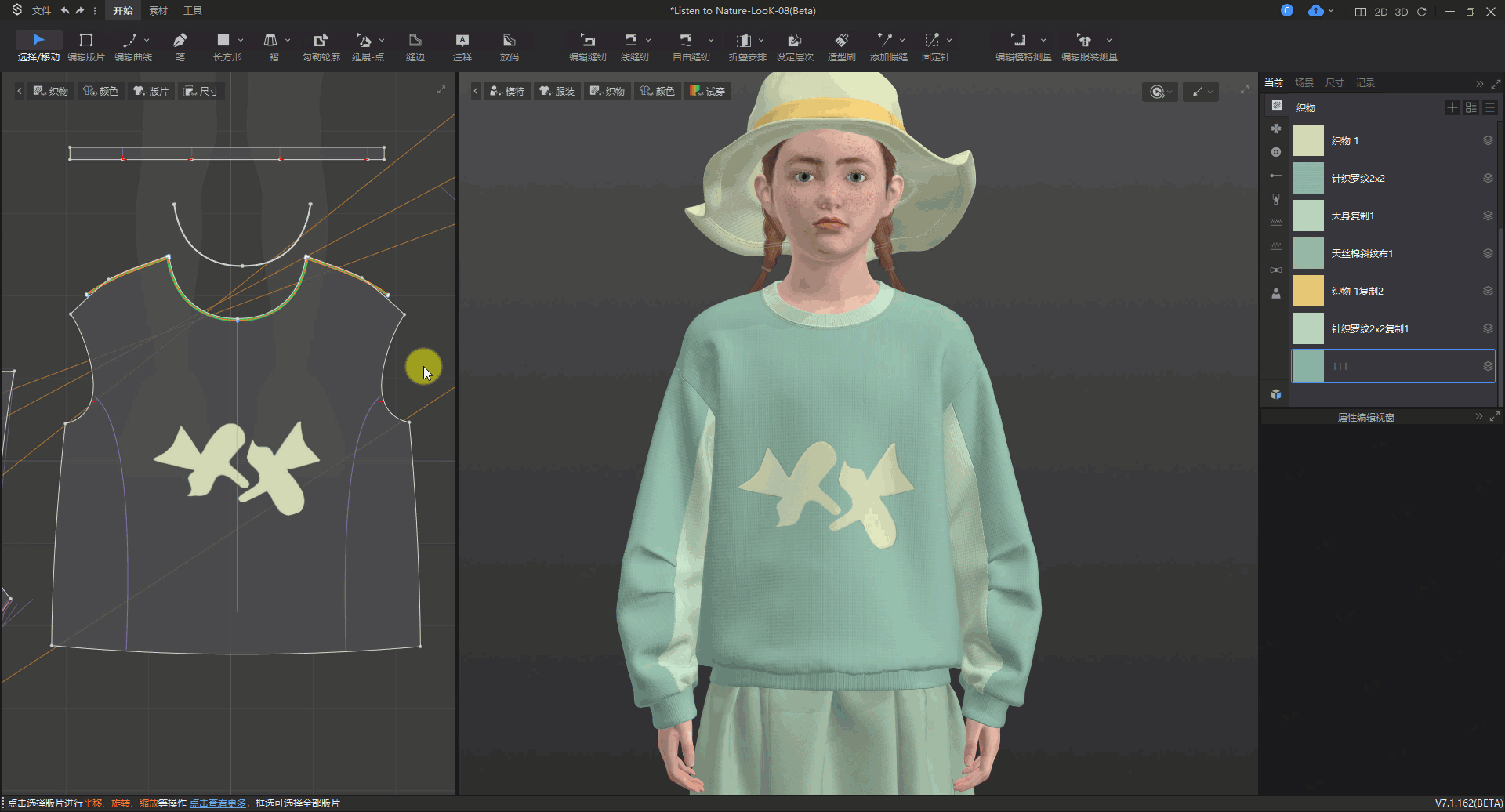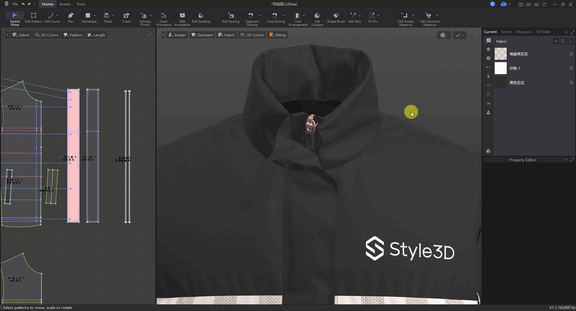 操作方法:选中内部线▶属性编辑视窗▶分割版片▶给不同部位设置不同织物▶修改厚度
