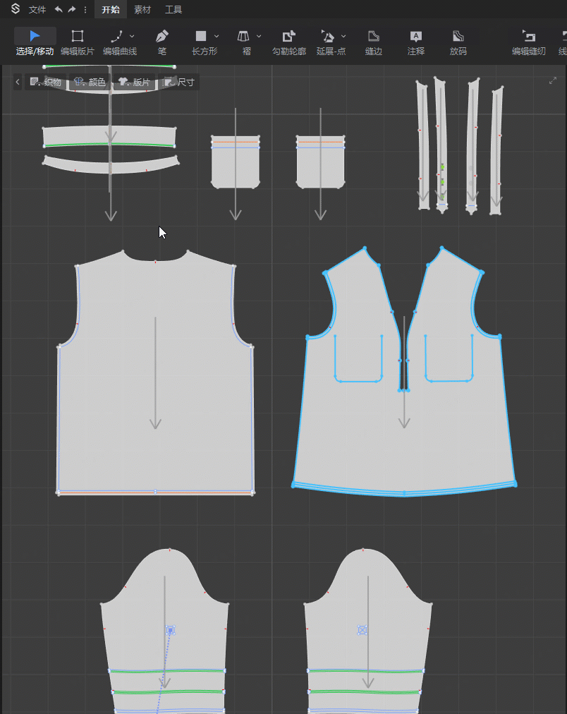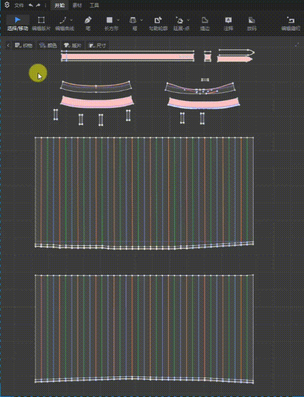 操作方法:选择移动/编辑版片模式下,选中某条内部线▶右键菜单▶【选择属性相同的内部线】▶折叠属性/弹性