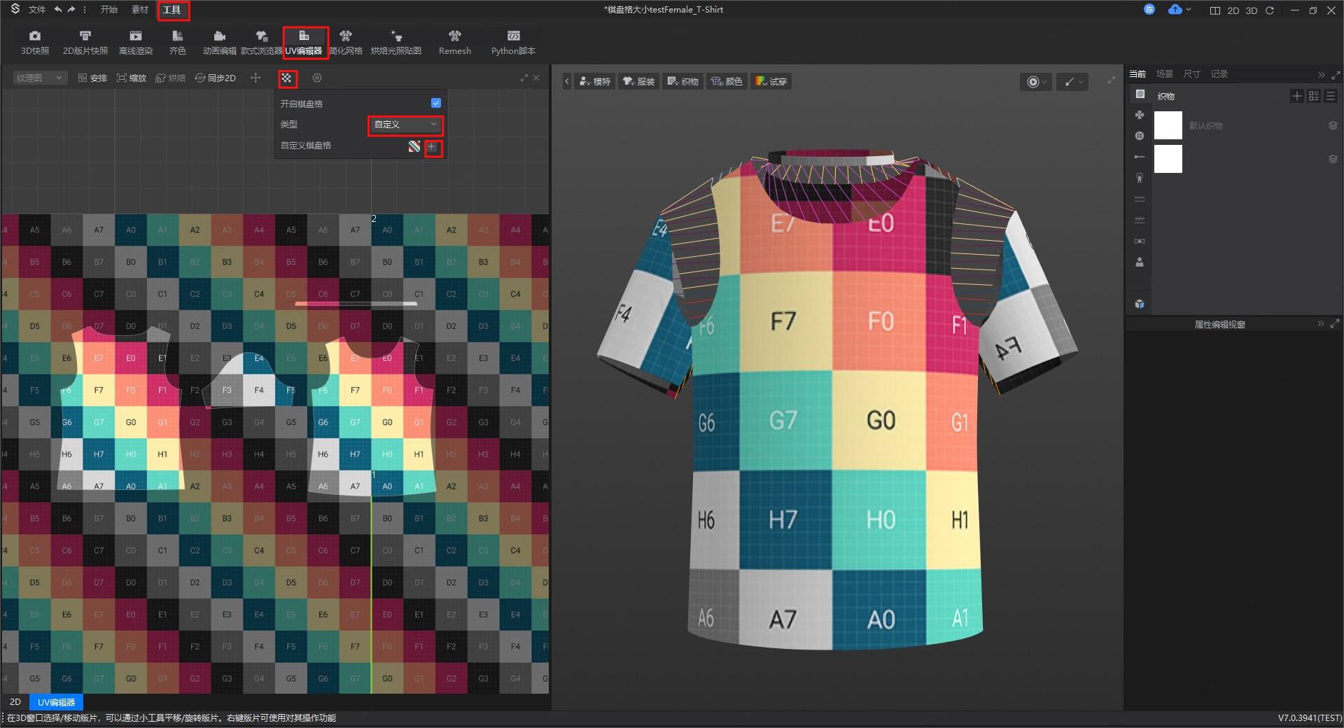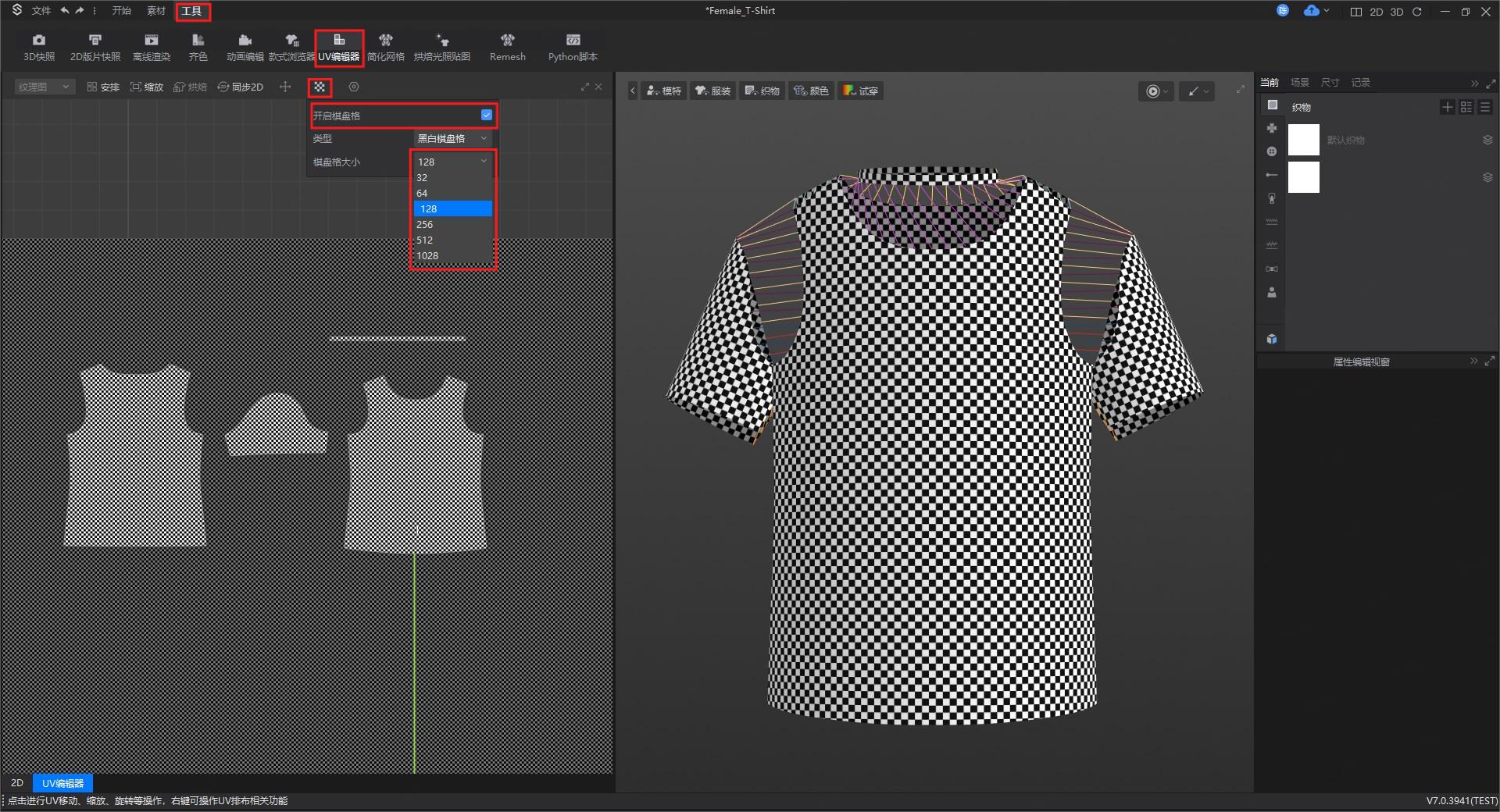 ① 将棋盘格纹理应用于UV网格,黑白棋盘格支持设置棋盘格大小