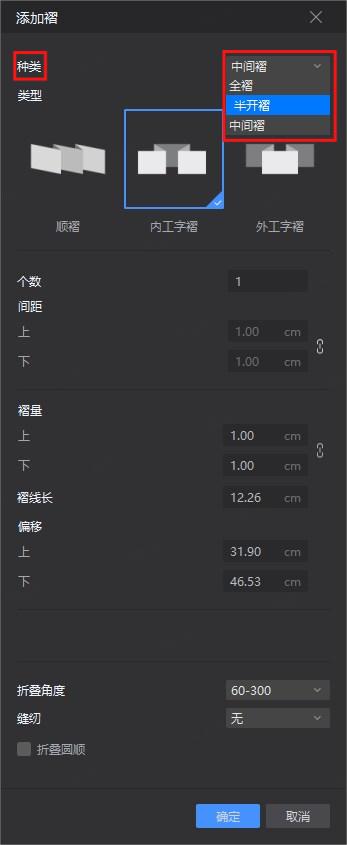 褶工具模式,新增【半开褶】【中间褶】类型。
