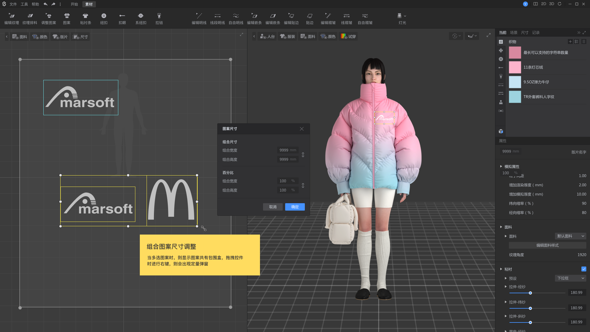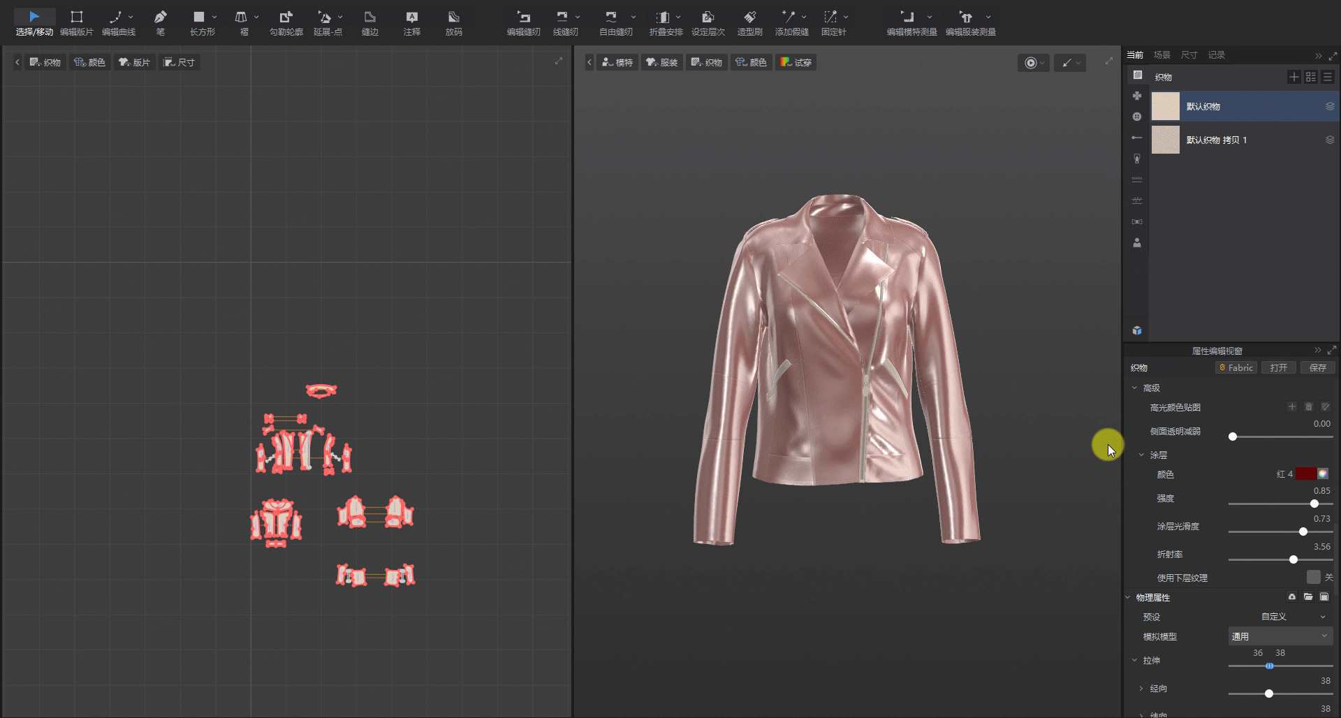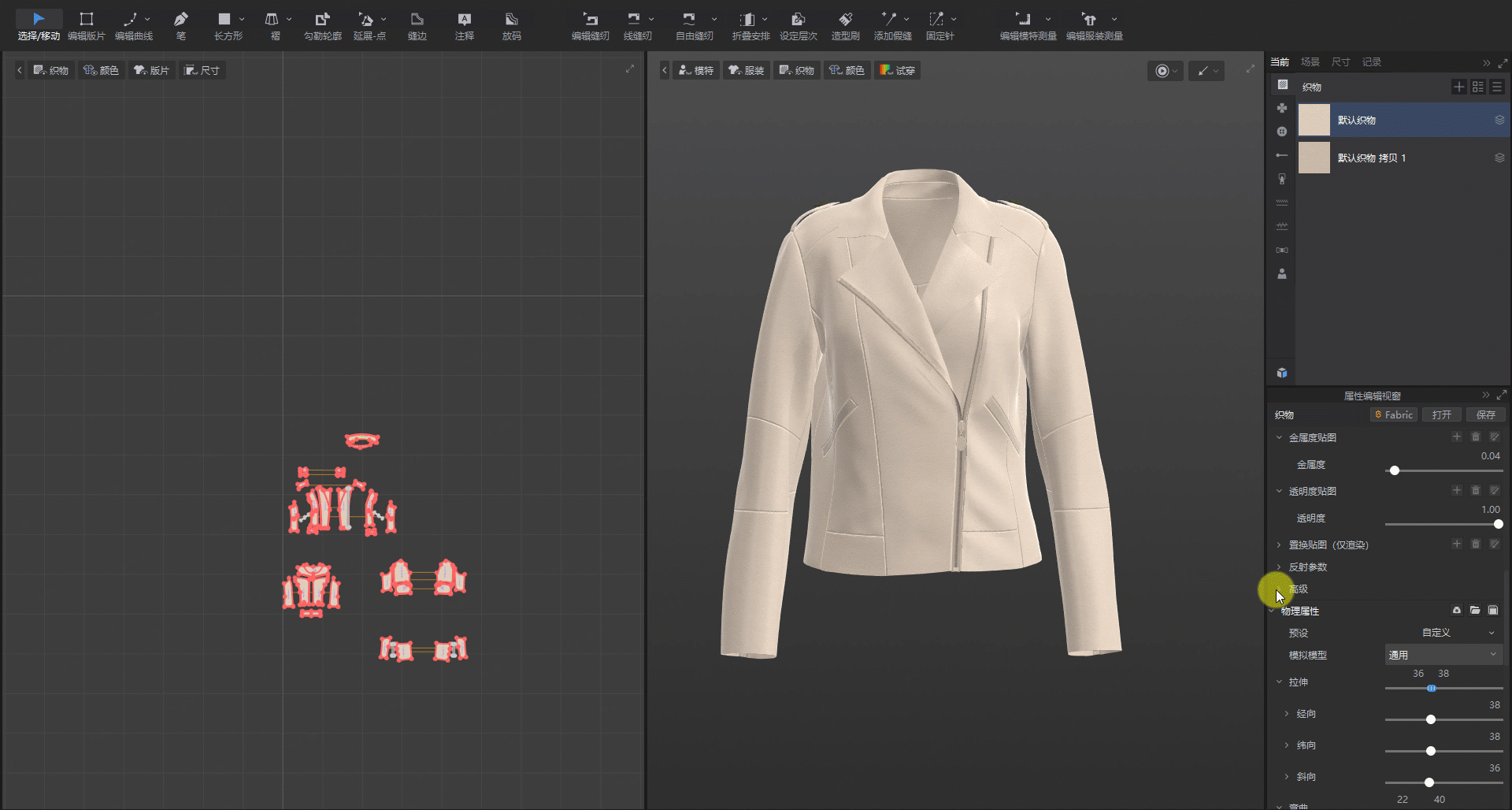 面料物理属性中拉伸、弯曲、变形率、变形强度支持一键调整各方向参数