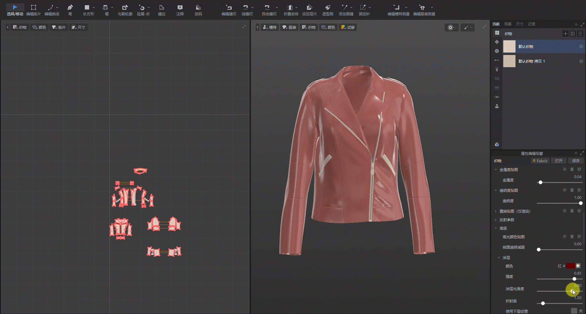 操作方法:选择面料▶属性编辑器【高级】▶涂层